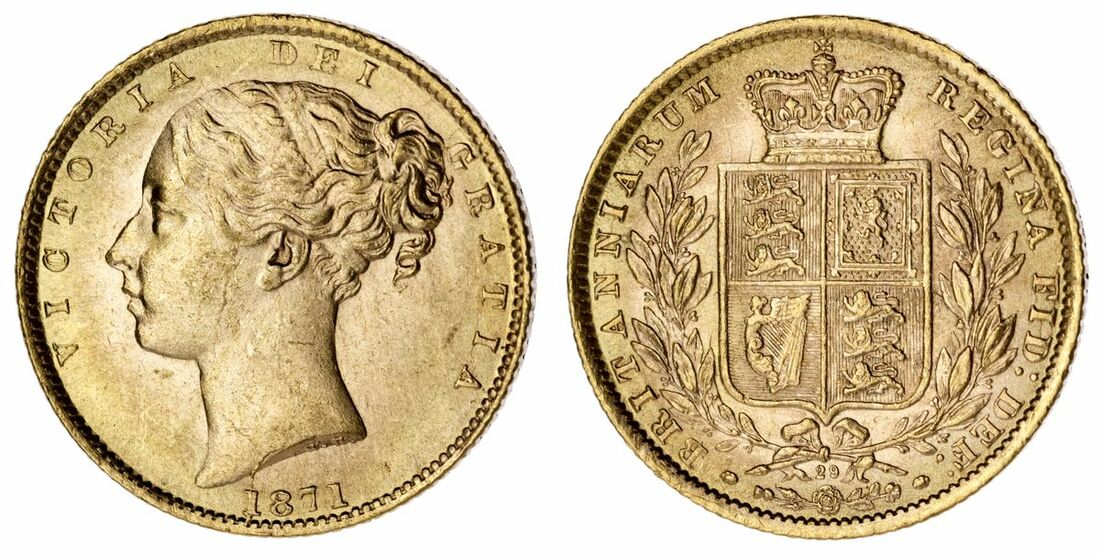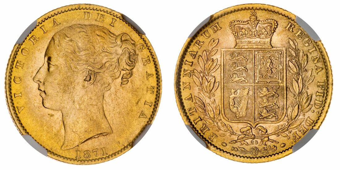 (g) NGC MS63 | Victoria (1837-1901), 'Shieldback' Sovereign, 1871 [Die 29], second larger young head, W.W. in relief on truncation, rev. crowned normal shield in wreath, edge milled, 8.00g, 6h (Marsh 55; Bentley 1148 same dies; MCE 531; Spink 3853B), die flaw through 1 and very subtle bagmarks, otherwise arrestingly choice and most pleasingly lustrous, a really good extremely fine and much as issued, in NGC holder, strictly graded MS63 (Cert. #6769433-001)