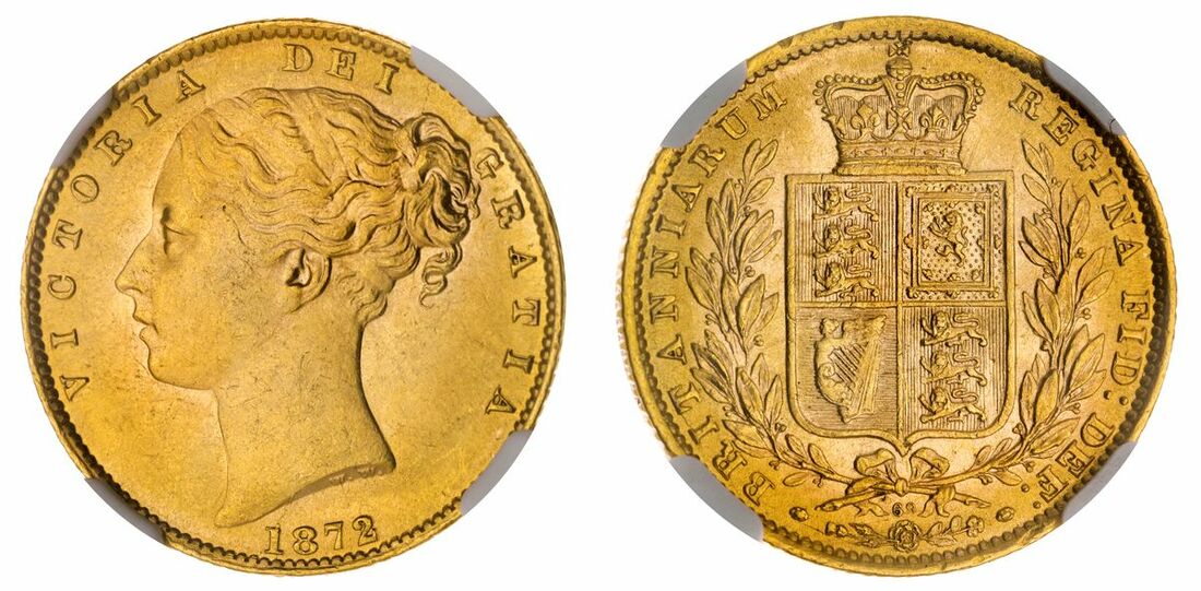 (g) NGC MS62 | Victoria (1837-1901), 'Shieldback' Sovereign, 1872 [Die 69], second larger young head, W.W. in relief on truncation, rev. crowned normal shield in wreath, edge milled, 7.98g, 6h (Marsh 56; MCE 533; Spink 3853B), VICTORIA double struck and with a hairline die flaw to the 1 in date, nonetheless with the faintest of contact marks to otherwise full and lustrous surfaces, extremely fine, in NGC holder, conservatively graded MS62 (Cert. #6769433-005)