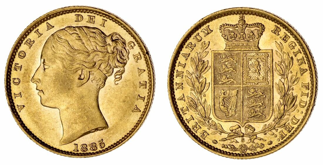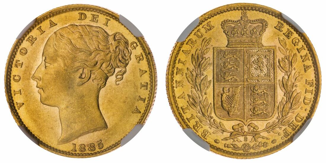 (g) NGC AU58 | Australia, Victoria (1837-1901), 'Shieldback' Sovereign, 1885 S, Sydney, Type ID, third young head, W.W. in relief on truncation, rev. crowned normal shield in wreath, edge milled, 7.97g, 6h (Marsh 81; Spink 3855B), the second 8 in date double struck and scuffing to obverse edge, otherwise lustrous surfaces, extremely fine, a scarcer date-variety combination, in NGC holder, graded AU58 (Cert. #6769433-009)