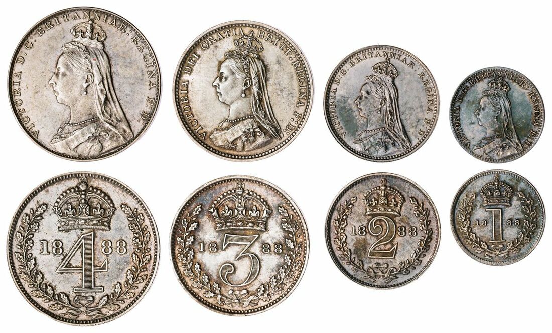 Victoria (1837-1901), 'Jubilee' Maundy Set, 1888, crowned Jubilee bust left, rev. crowned mark of value, edge plain (Bull 3545; ESC 2502; Spink 3932), cleaned hence bright but lustrous, extremely fine or better for strike, in contemporary but undated case (4)