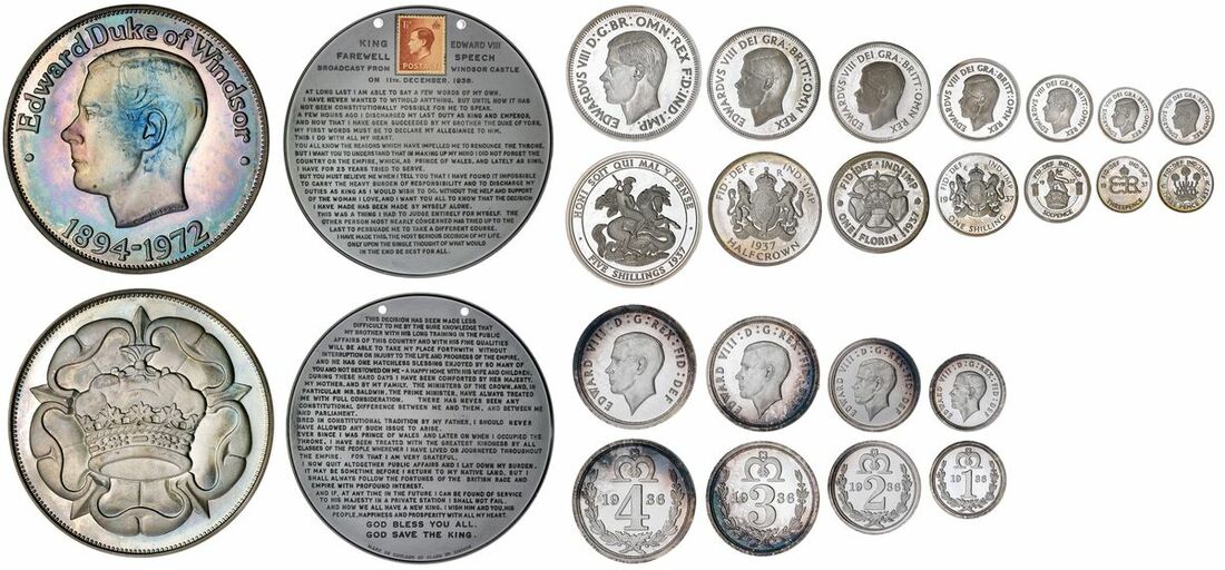 (g) Edward VIII (1936), Fantasy Proof Seven Coin Set, 1937, Crown to Threepence (7), some haziness and toning to otherwise brilliant fields, much as struck; Fantasy Maundy Set, 1936, bare head left, rev. crowned mark of value, edges plain, toned, brilliant as struck; Death of the Duke of Windsor, AR Medal, 1972, by G. A. Holman, . EDWARD DUKE OF WINDSOR ., bare head left, 1894-1972 in exergue, rev. crown upon rose, plain edge, 39mm, 27.27g (Eimer 2124), toned to brilliant surfaces, about as struck; Bakelite King Edward VIII Farewell Speech Medal, 1936, by Clang Ltd, inscription, rev inscription, as struck (4)