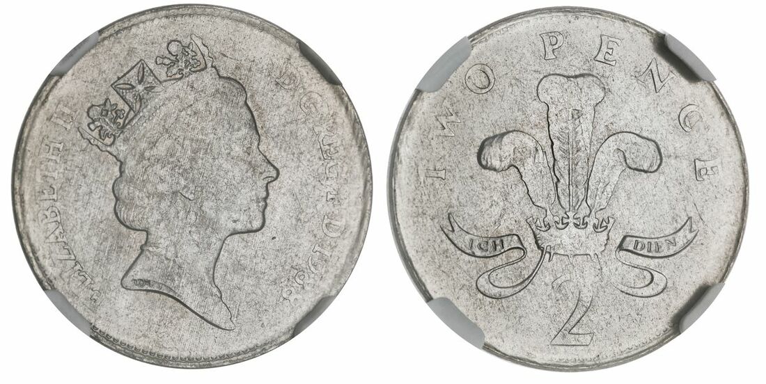 NGC MINT ERROR MS65 Elizabeth II (1952-2022), Two Pence, 1988, struck on a foreign white-metal coloured planchet, third crowned portrait right, rev. Ostrich feathers dividing ICH DIEN scroll, edge plain, 6.50g, 12h (cf. Spink C3), softly struck but fully lustrous, much as issued, in NGC holder, graded MINT ERROR MS65 (Cert. #6295598-003)