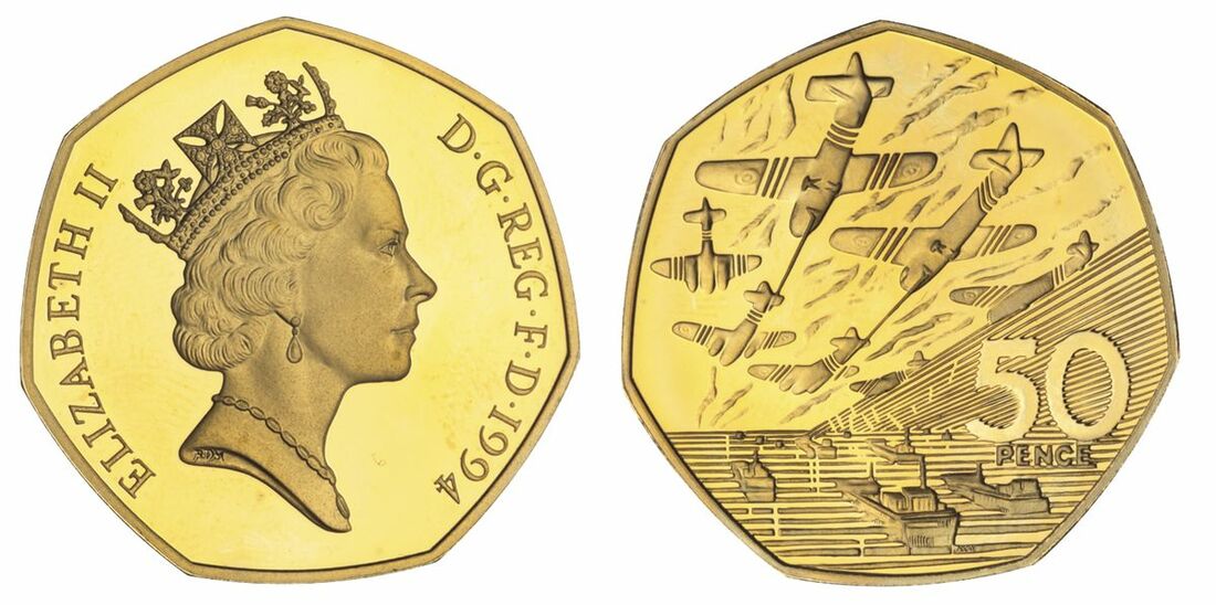 (g) NGC PF67 UCAM | Elizabeth II (1952-2022), '50th Anniversary of the Normandy Landings', Commemorative Gold Proof Fifty Pence, 1994, by Raphael Maklouf and John Mills, third crowned portrait right, rev. Allied Invasion Force of Horsa Gliders and D-Day landing craft destined for Normandy, edge plain, 26.32g, 12h (Spink H6), lightly fingermarked, otherwise brilliant, practically as struck, in NGC holder, graded PF67 ULTRA CAMEO (Cert. #6382915-002)