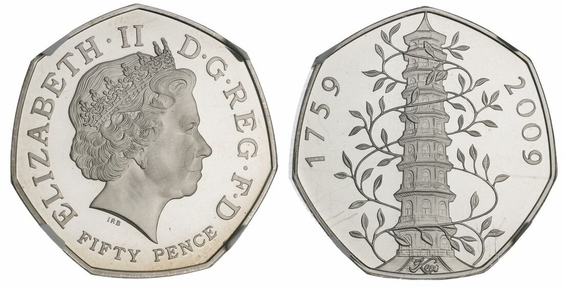 NGC PF69 ULTRA CAMEO | Elizabeth II (1952-2022), Proof "Kew Gardens" Fifty Pence, 2009, 250th Anniversary of the Foundation of the Royal Botanical Gardens, Kew, ELIZABETH. II D.G. REG. F.D FIFTY PENCE, crowned head right, rev. pagoda, plain edge, 12h (Spink H19), brilliant, as struck, in NGC holder, graded PF69 ULTRA CAMEO (Cert. #6027717-004)