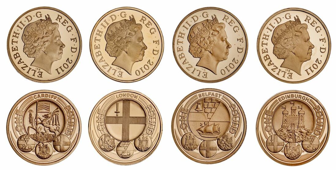 (g) Elizabeth II (1952-2022), 'Capital Cities of the United Kingdom', Commemorative Gold Proof Pound 4-Coin Set, 2010-2011 (4), by Ian Ranklin Broadley and Stuart Devlin, fourth crowned portrait right, rev. heraldic devices of the Cities of Cardiff, edge italic-lettered upwards and milled: Y DDRAIG GOCH DDYRY CYCHWYN, 19.61g, 12h (Cert. 387 of 524 issued); London, similar, edge italic-lettered downwards and milled: DOMINE DIRIGE NOS, 19.61g, 12h (Cert. 469 of 950 issued); and, Belfast, similar, edge italic-lettered downwards and milled: 'PRO TANTO QUID RETRIBUAMUS', 19.61g, 12h (Cert. 624 of 585 issued); and, Edinburgh, similar, edge italic-lettered downwards and milled: 'NISI DOMINUS', 19.61g, 12h (Cert. 440 of 499 issued) (Spink J28, J29, J30, J31), an exceedingly rare composite Gold Proof Set of the 'Capital Cities of the United Kingdom', unlisted as such in the Spink Catalogue, minor wisps on obverse of London and Edinburgh (the Key Type), otherwise brilliant uncirculated and very rare, in Royal Minted custom case of issue (4)