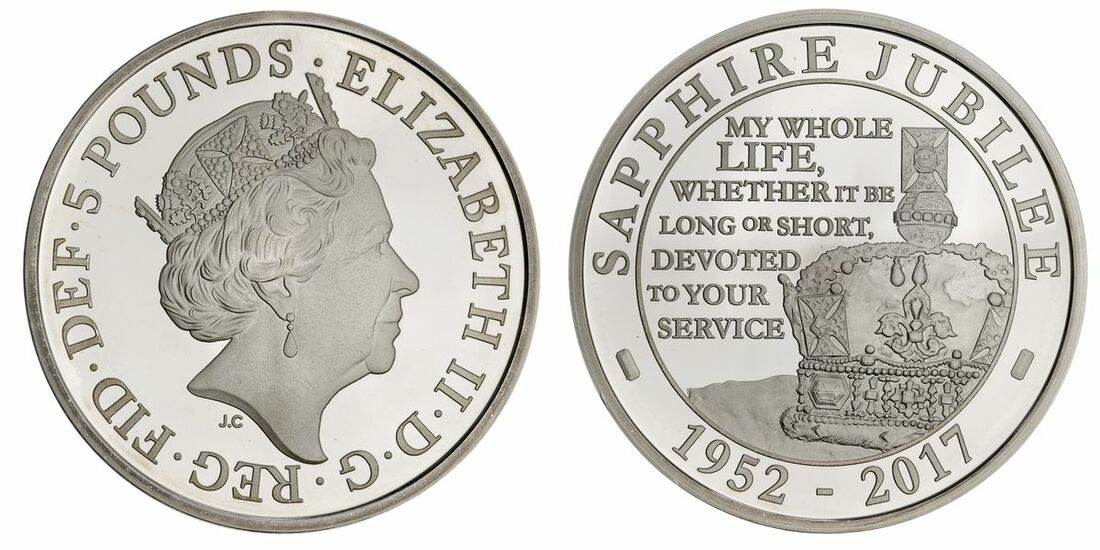 Elizabeth II (1952-2022), 'Sapphire Jubilee' Silver Proof Five Pounds, 2017, crowned bust right, by Jody Clark, rev. SAPPHIRE JUBILEE 1952 - 2017, State Crown, MY WHOLE LIFE, WHETHER IT BE LONG OR SHORT, DEVOTED TO YOUR SERVICE, inscribed left, by Glyn Davies, lettered edge, 12h (Spink L51), brilliant as struck, in Royal Mint case of issue, No. 2897