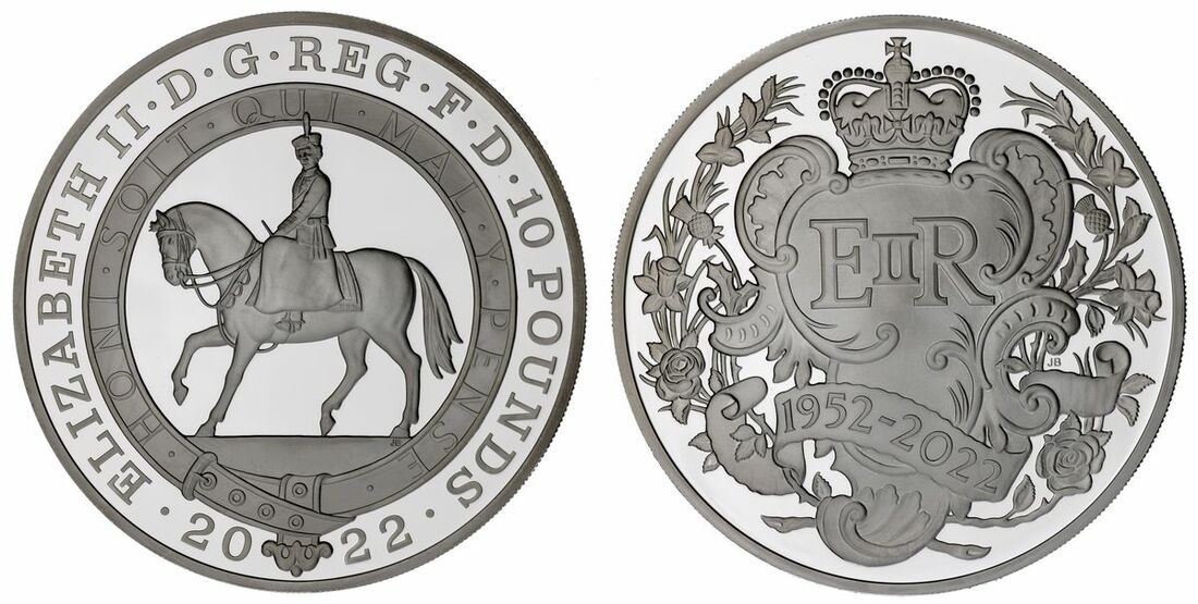 Elizabeth II (1952-2022), 'Platinum Jubilee' Silver Proof Ten Pounds, 2022, Queen on horseback within Garter, by J Bergdahl, rev. crowned Cypher, surrounded by emblems of the floral emblems of the United Kingdom, by J Bergdahl, milled edge, 12h (Spink M22), brilliant as struck, in Royal Mint case of issue, No. 203