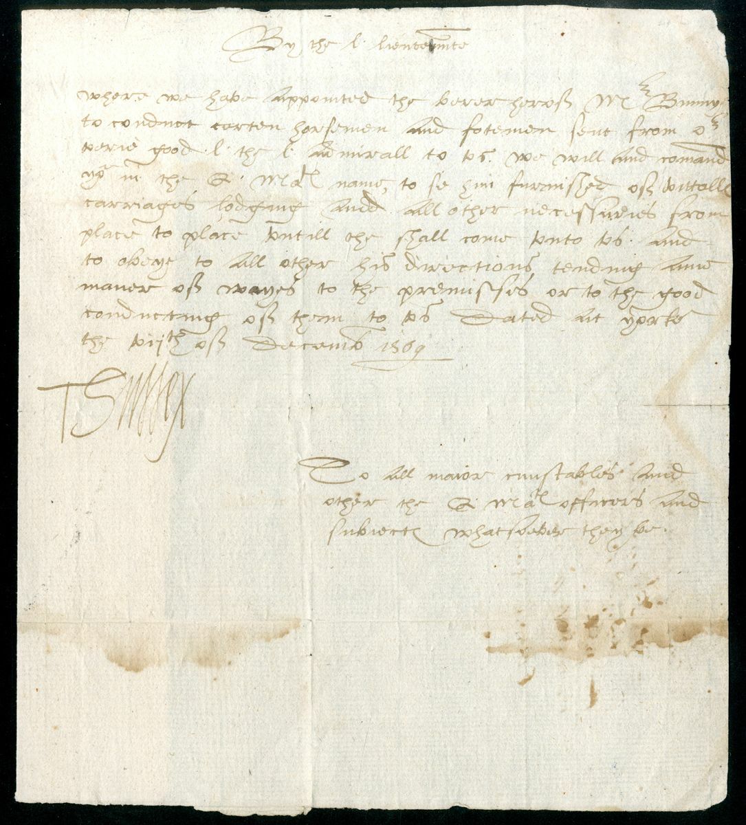To all majors, cunstables and other the Queens's Majesty's officers and subjects whatsoever they be" [sic], announcing: "we have appointed the berer herof Mr. Bunny to conduct certen horsemen and fotemen sent from our verie good lord the lord admiral to us, we will and comand you in the Q[ueen] Majesty's name, to see him furnished of vittalls carriages lodging and all other neccessaries from place to place untill he shall come unto us. And to obey to all other his directions tending anie maner of wayes to the premisses or to the good conducting of them to us. Dated our yeare the eigte of Decemb 1569". Signed "T Sussex" [sic], some new paper added not affecting the text, fine and very rare, dating mere days before Sussex's advance from York to crush the 'Rising of the North'