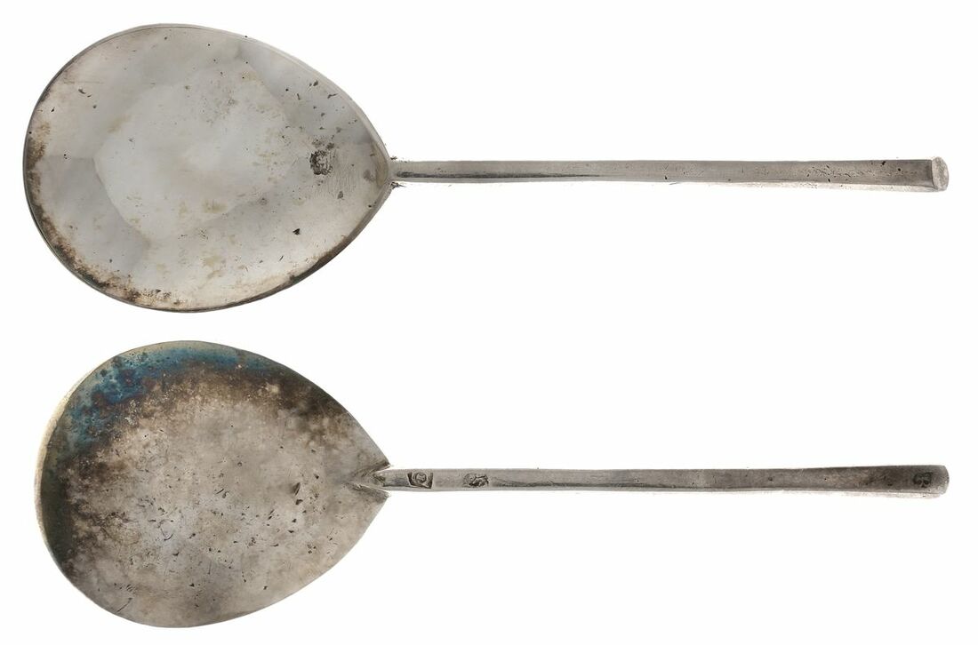"...in beinge over confidente to make upp such a quantity of spones without makinge any assayes of the goodnes of his silver..." | Stuart (1603-1649), Early Jacobean Cast Silver ‘Slip Top’ Spoon, 1607/8 [k], .925 Fine [Lion Passant], by James Cluatt [CI or 'Crescent enclosing I'], London [Lion's Head], hallmarked in bowl and at reverse base and terminus of stem, 100mm x 5.7mm. x 4.25mm. [stem]; 63.5mm. x 51.0mm. [bowl]; 42.64g [1 oz; 9dwt; 4, 3/10 grns] (Jackson’s, English Goldsmith’s and their Makers Marks, 1905, pp. 81; T a Kent, 1981, 'London Silver Spoonmakers' 1500-1697, The Silver Society), pp. 19, no. 3; Indianapolis Museum of Art, ref. 2010.108), pitted and polished surfaces to bowl and stem from moderate usage, faint toning to reverse of bowl, otherwise very fine and unimpinged by contemporary or later familial personalisation, rare and attributable to one of London's 'First Fifteen Specialist Spoonmakers' who was not unfamiliar to his own hallmark scandal!
