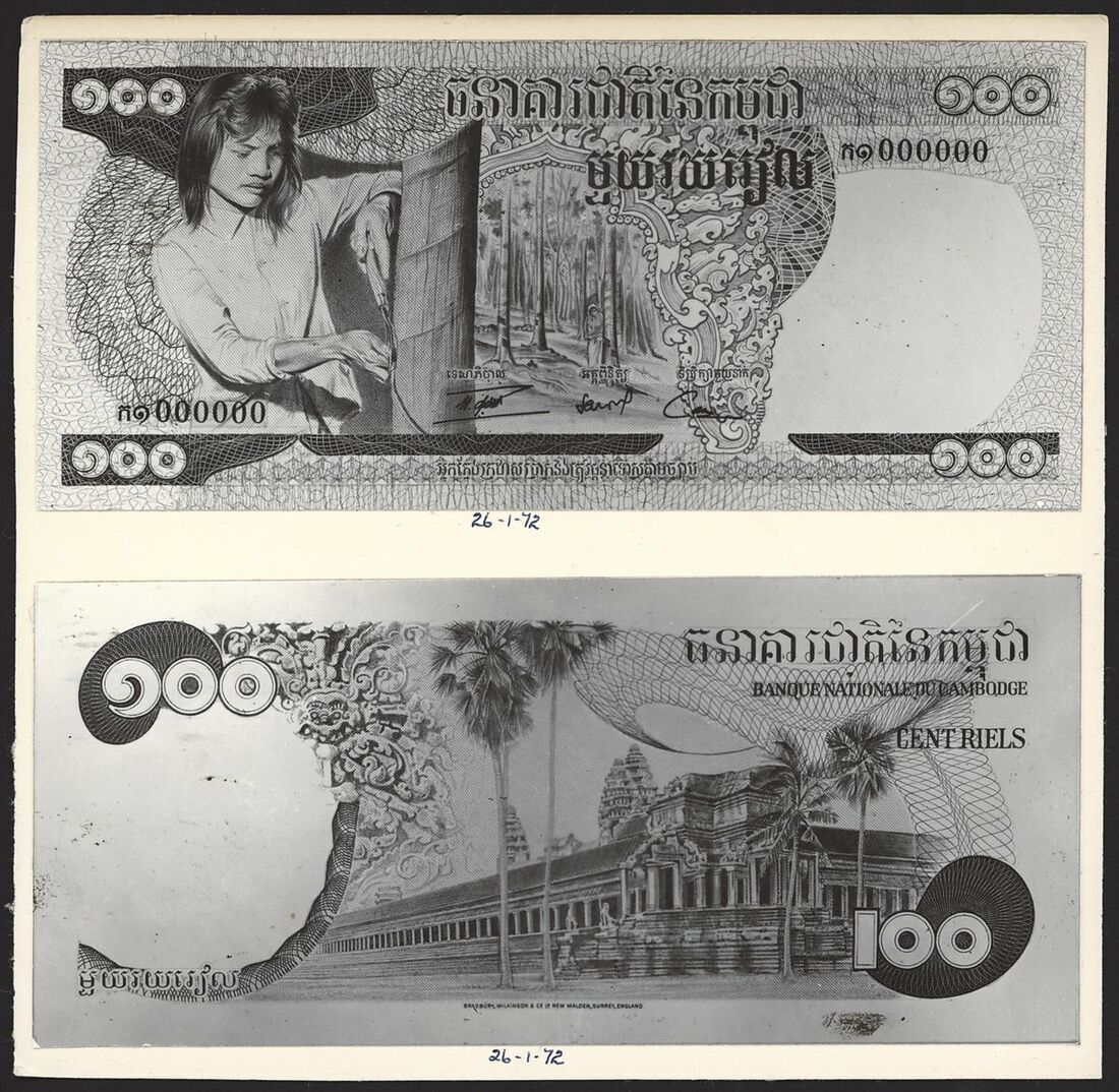 Institut D'Emission du Royaume du Cambodge, unissued photo proof pair, 500 riels, 1972, (obverse and reverse on single card)