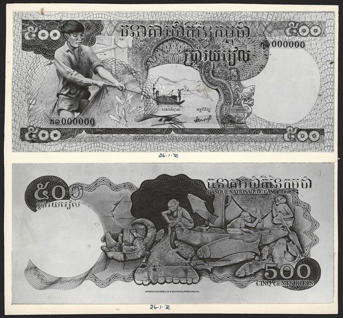 Institut D'Emission du Royaume du Cambodge, unissued photo proof pair, 500 riels, 1972, (obverse and reverse on single card)