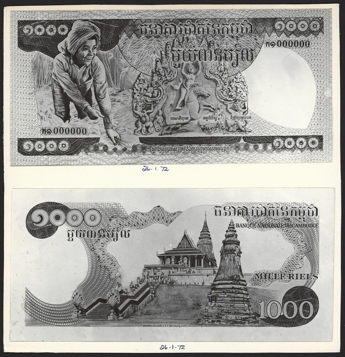 Institut D'Emission du Royaume du Cambodge, unissued photo proof pair, 1000 riels, 1972, (obverse and reverse on single card)