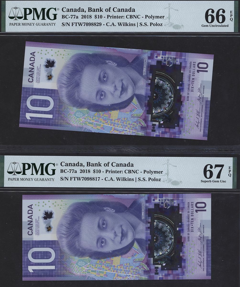 (x) Bank of Canada, a pair of $10, 2018, serial numbers FTW7098817, FTW1098829, (Pick unlisted, BC-77a), in PMG holders 67 EPQ Superb Gem Uncirculated, 66 EPQ Gem Uncirculated