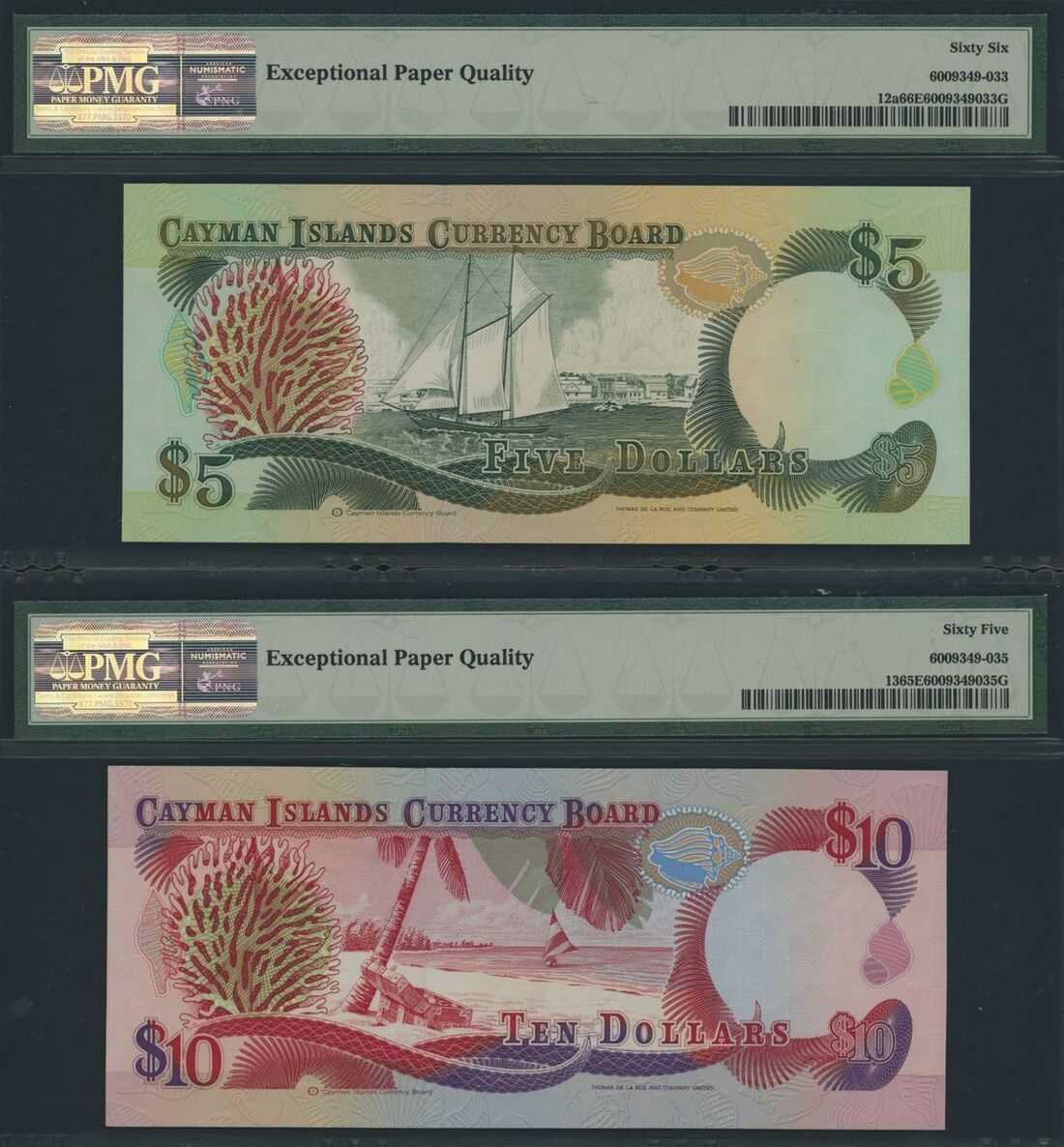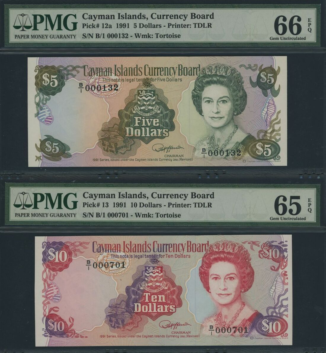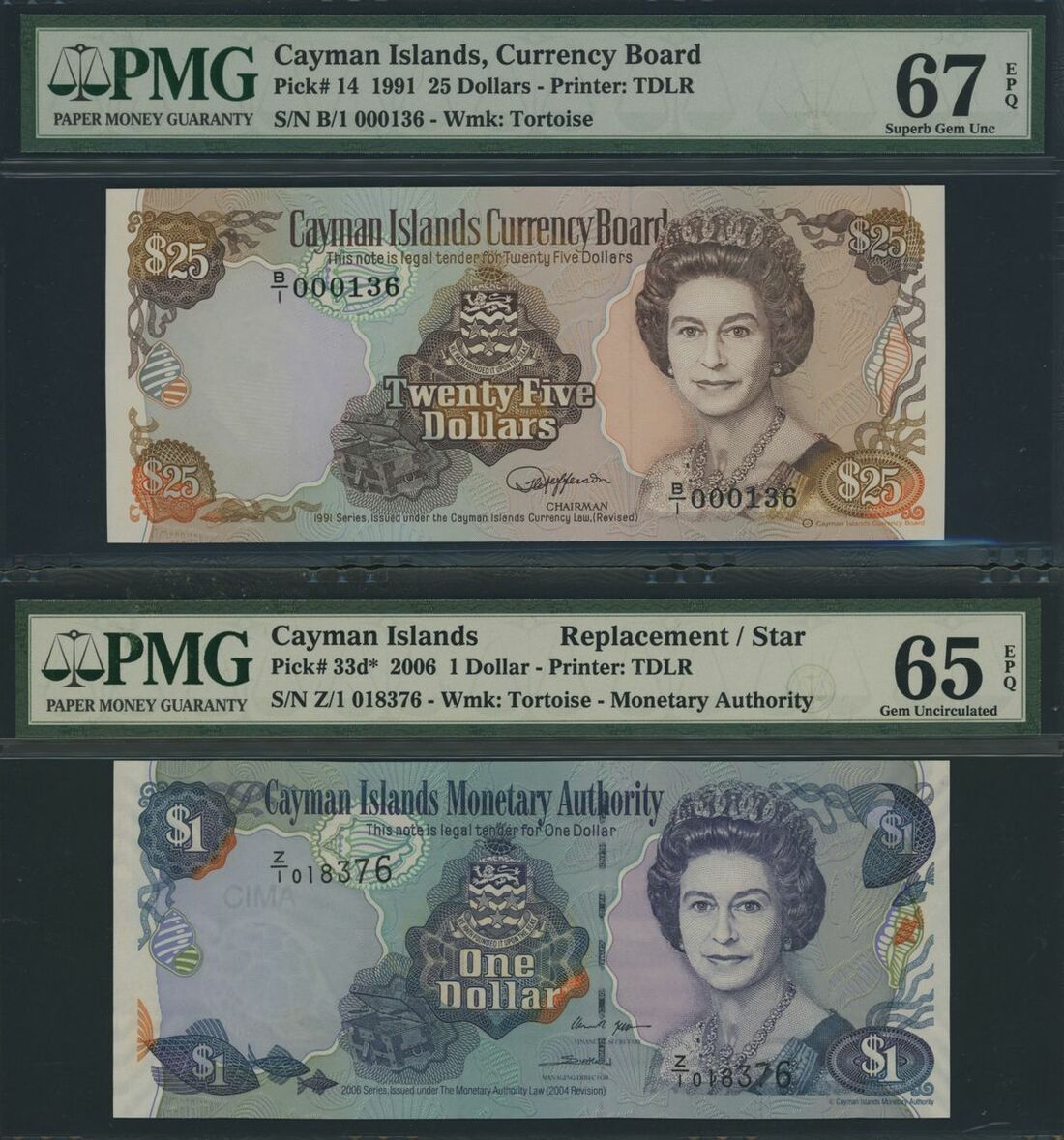 Cayman Islands, a group of replacement 1 dollar, 2006, 5, 10 & 25 dollars, 1991, (Pick 33d, 12a, 13, 14), in PMG holder 65 EPQ Gem Uncirculated to 67 EPQ Superb Gem Uncirculated (4 notes)