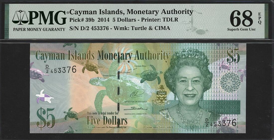 (x) Cayman Islands Monetary Authority, 5 dollars, 2014, serial number D/2 453376, (Pick 39b), in PMG holder 68 EPQ Superb Gem Uncirculated