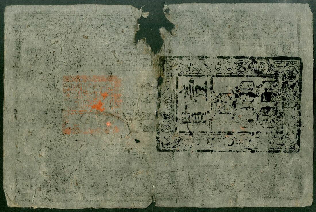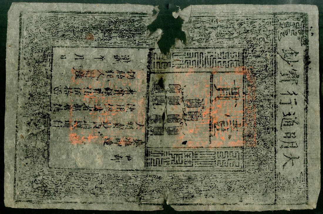 Ming Dynasty, Da Ming Bao Chao, 1 kuan, 1368-1399, black text on grey mulberry bark, two rectangular red seals on face, 10 strings of cash at centre