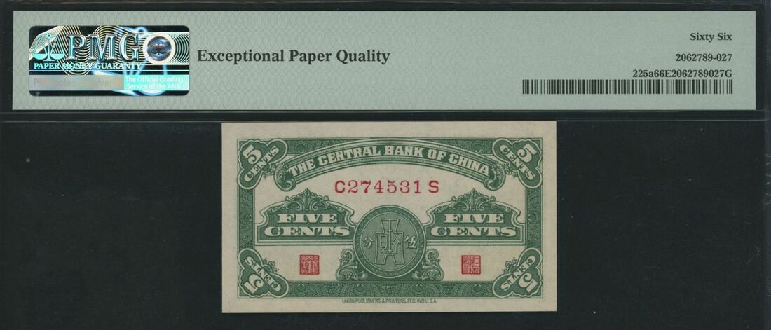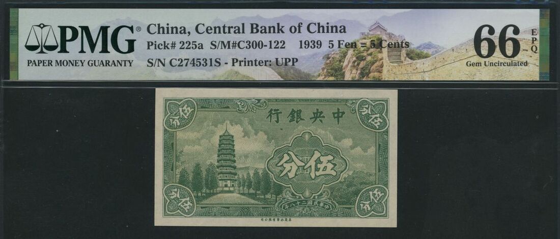 (x) Central Bank of China, 5 fen = 5 cents, 1939, serial number C274531S, (Pick 225a), in PMG holder 66 EPQ Gem Uncirculated