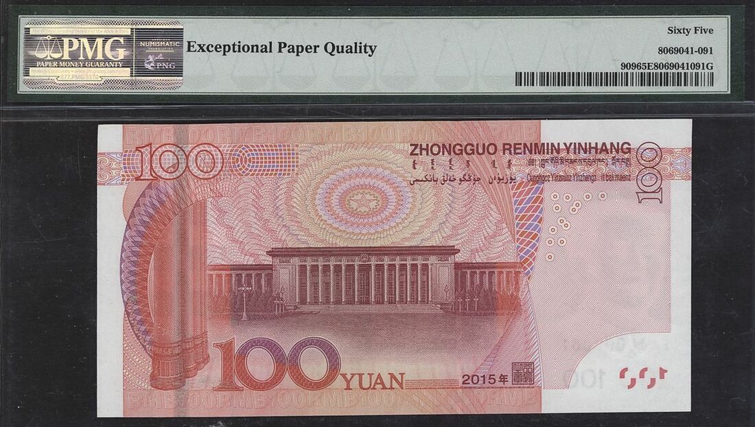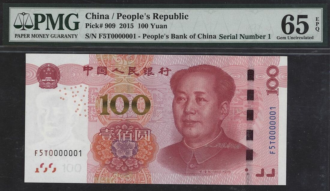 People's Republic of China, 100 yuan, 2015, serial number F5T0000001, (Pick 909), in PMG holder 65 EPQ Gem Uncirculated