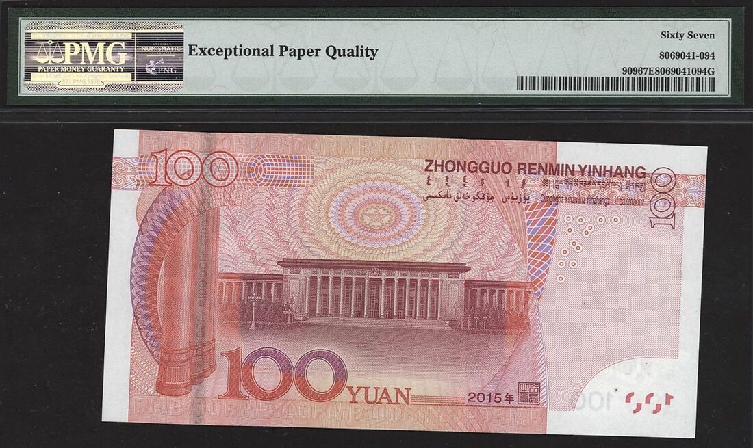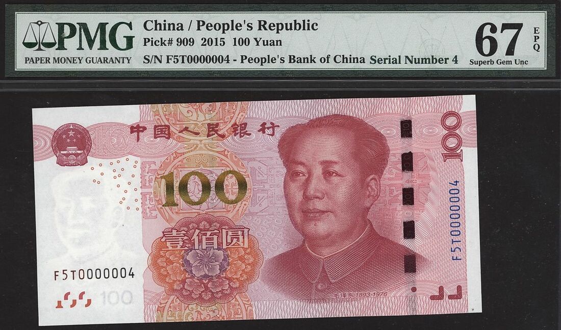 People's Republic of China, 100 yuan, 2015, serial number F5T0000004, (Pick 909), in PMG holder 67 EPQ Superb Gem Uncirculated