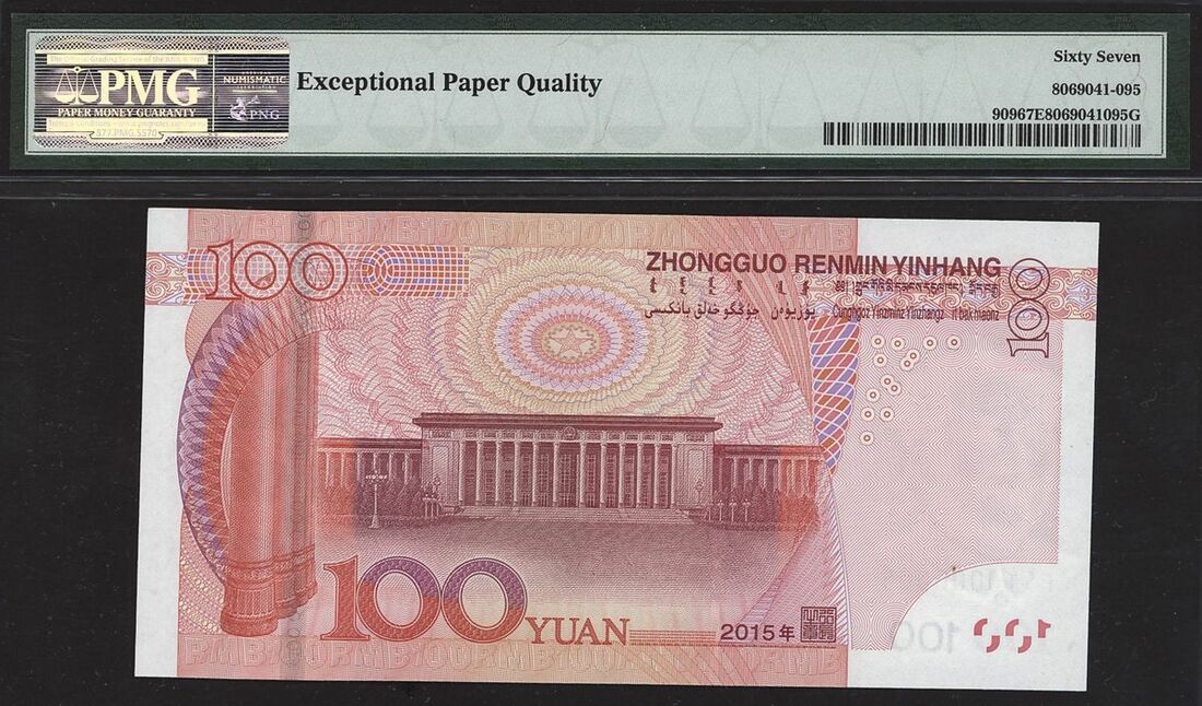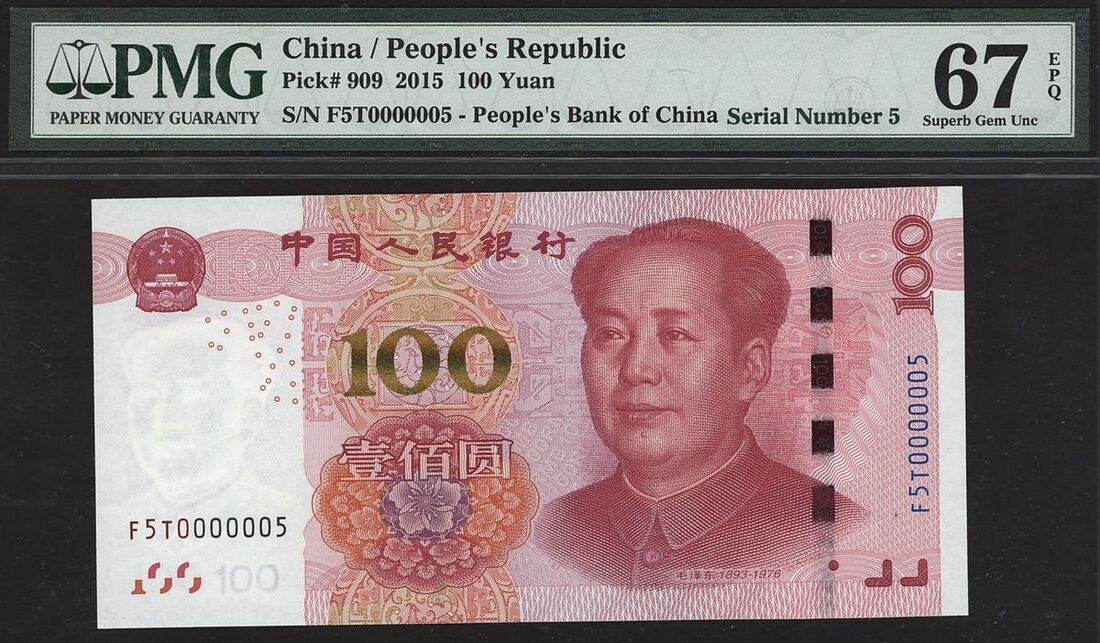 People's Republic of China, 100 yuan, 2015, serial number F5T0000005, (Pick 909), in PMG holder 67 EPQ Superb Gem Uncirculated