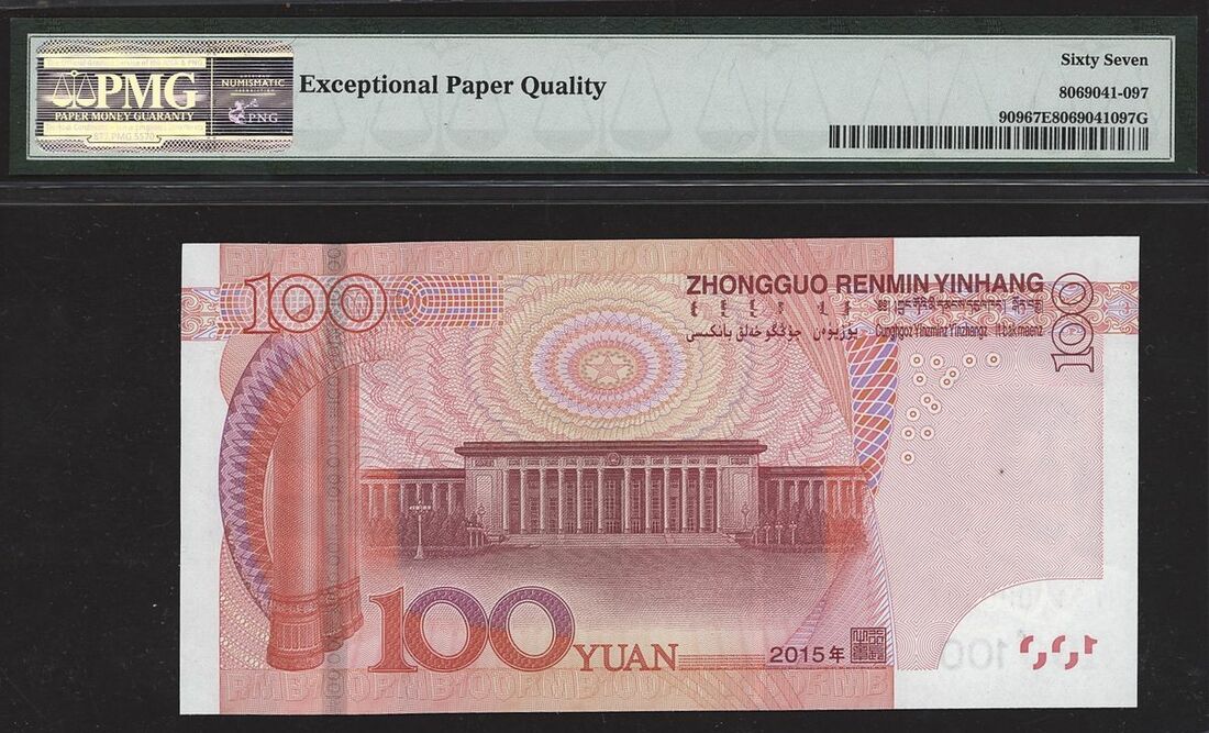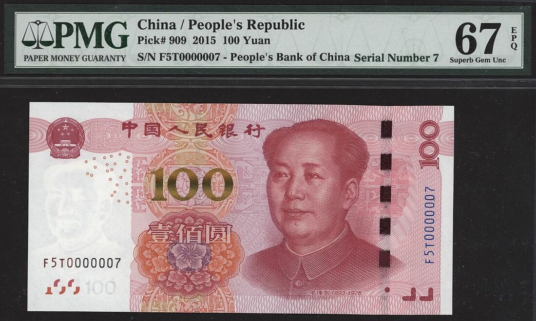 People's Republic of China, 100 yuan, 2015, serial number F5T0000007, (Pick 909), in PMG holder 67 EPQ Superb Gem Uncirculated