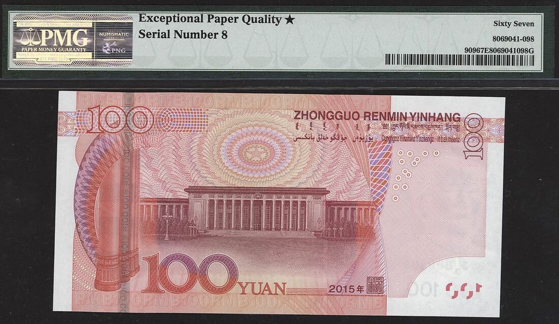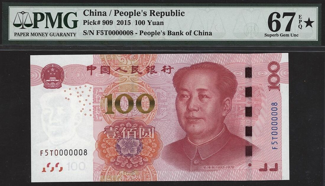 People's Republic of China, 100 yuan, 2015, serial number F5T0000008, (Pick 909), in PMG holder 67 EPQ Star Superb Gem Uncirculated