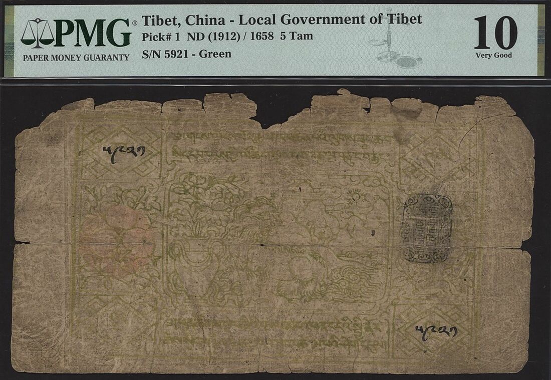 Government of Tibet, 5 tam, ND (1912), serial number 5921, (Pick 1), in PMG holder 10 Very Good