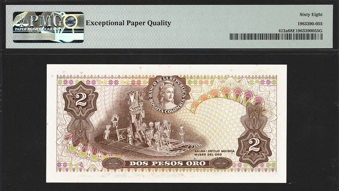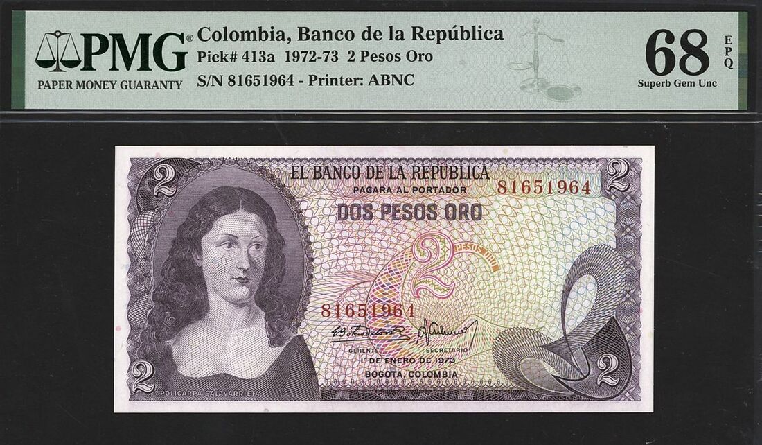 (x) Banco de la Republica, Colombia, 2 pesos oro, 1973, serial number 81651964, (Pick 413a), in PMG holder 68 EPQ Superb Gem Uncirculated