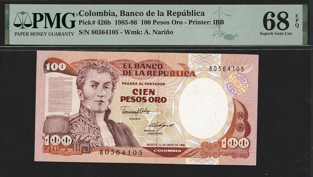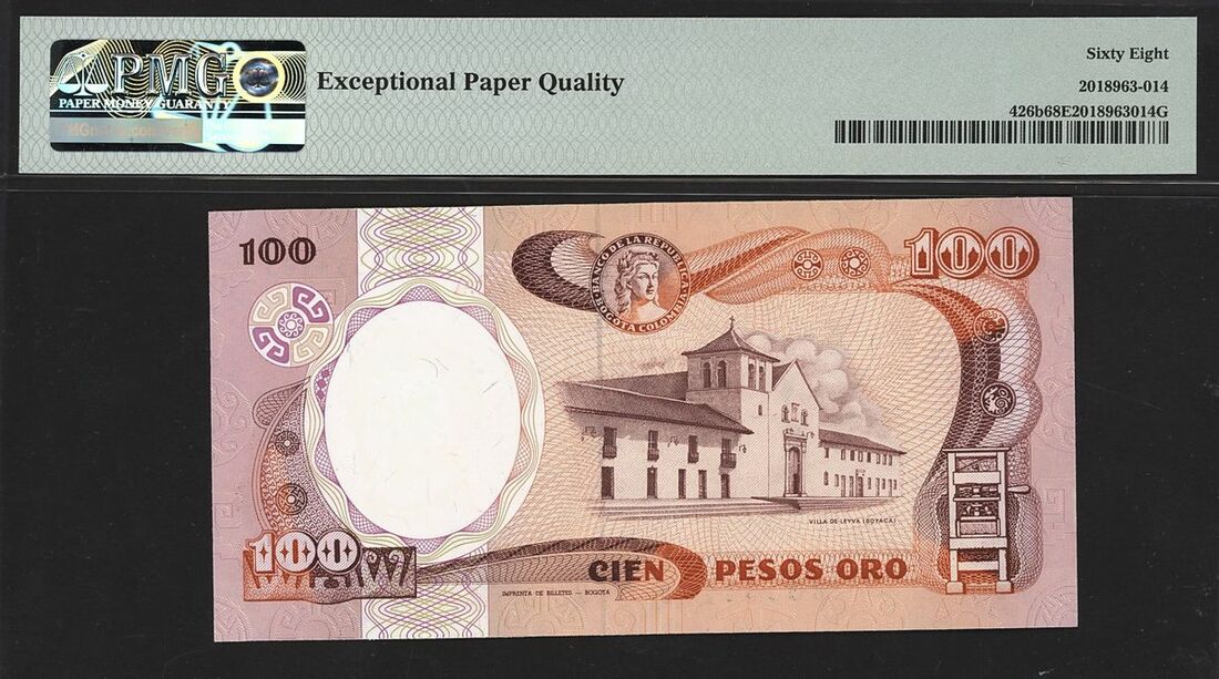 (x) Banco de la Republica, Colombia, 100 pesos oro, 1986, serial number 80364105, (Pick 426b), in PMG holder 68 EPQ Superb Gem Uncirculated