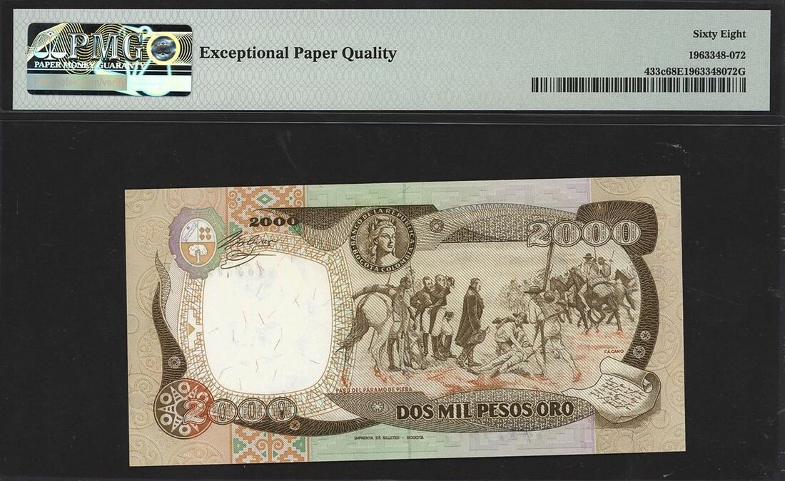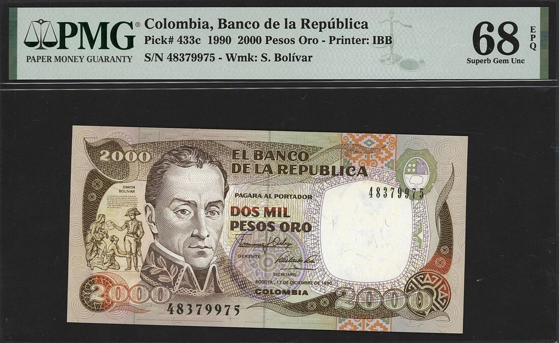 (x) Banco de la Republica, Colombia, 2000 pesos oro, 1990, serial number 48379975, (Pick 433c), in PMG holder 68 EPQ Superb Gem Uncirculated