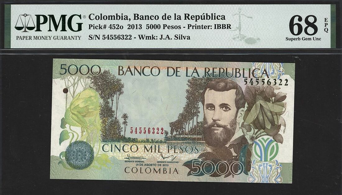 (x) Banco de la Republica, Colombia, 5000 pesos, 2013, serial number 54556322, (Pick 452o), in PMG holder 68 EPQ Superb Gem Uncirculated