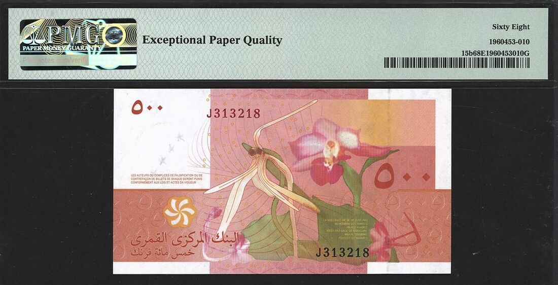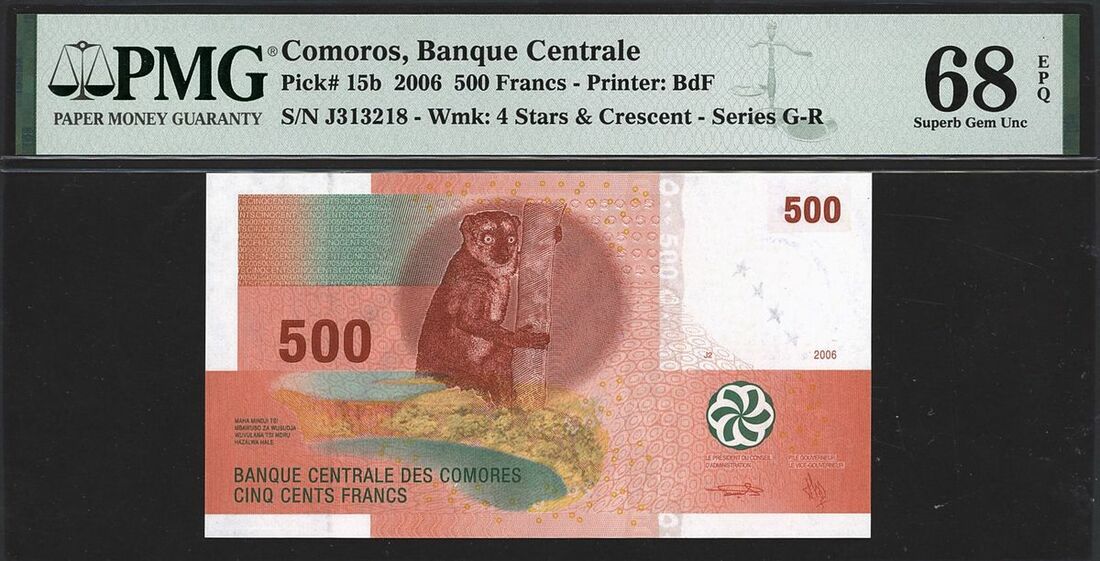 (x) Banque Centrale, Comoros, 500 francs, 2006, serial number J313218, (Pick 15b), in PMG holder 68 EPQ Superb Gem Uncirculated