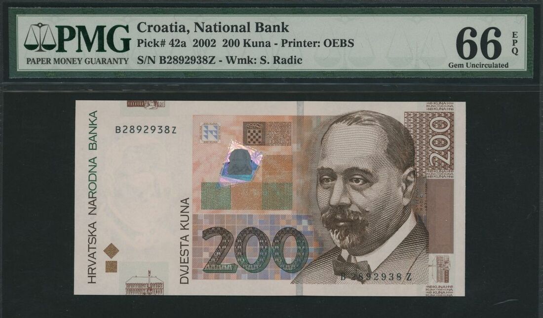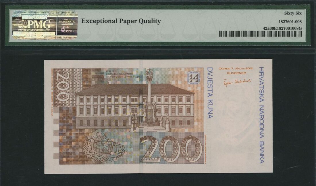 (x) National Bank, Croatia, 200 kuna, 2002, serial number B2892938Z, (Pick 42a), in PMG holder 66 EPQ Gem Uncirculated