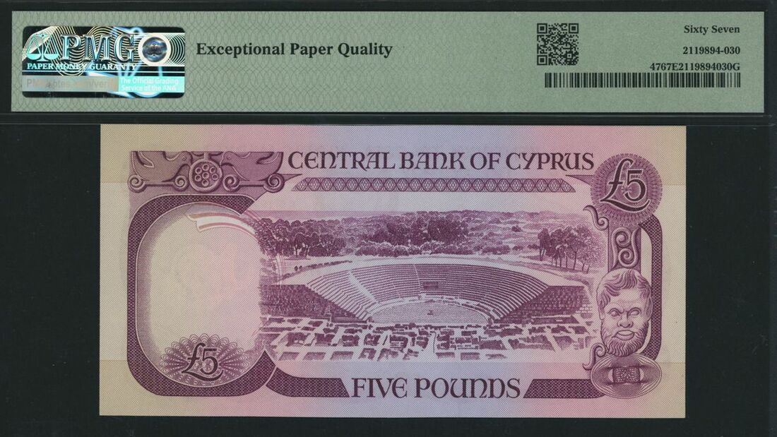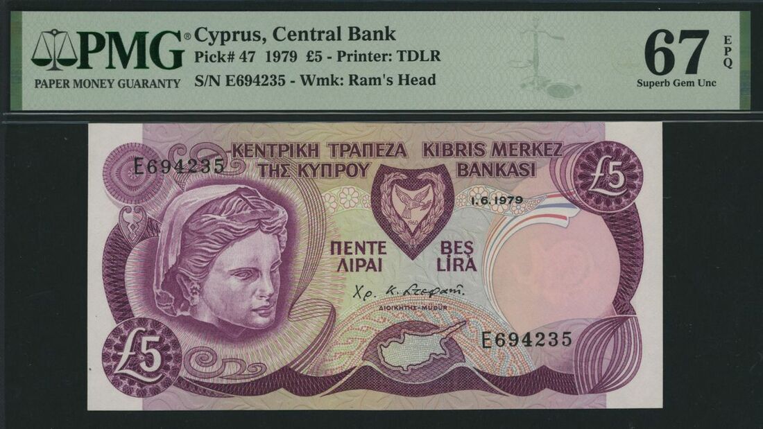 (x) Central Bank, Cyprus, 5 pounds, 1979, serial number E694235, (Pick 47), in PMG holder 67 EPQ Superb Gem Uncirculated