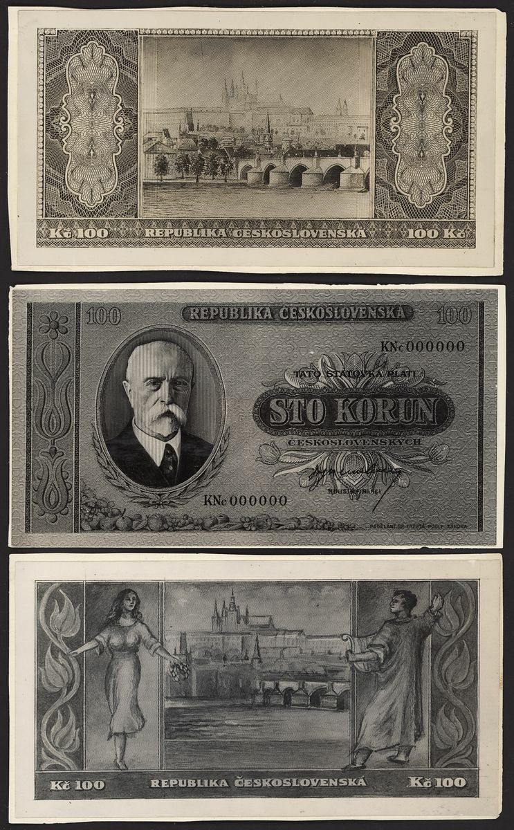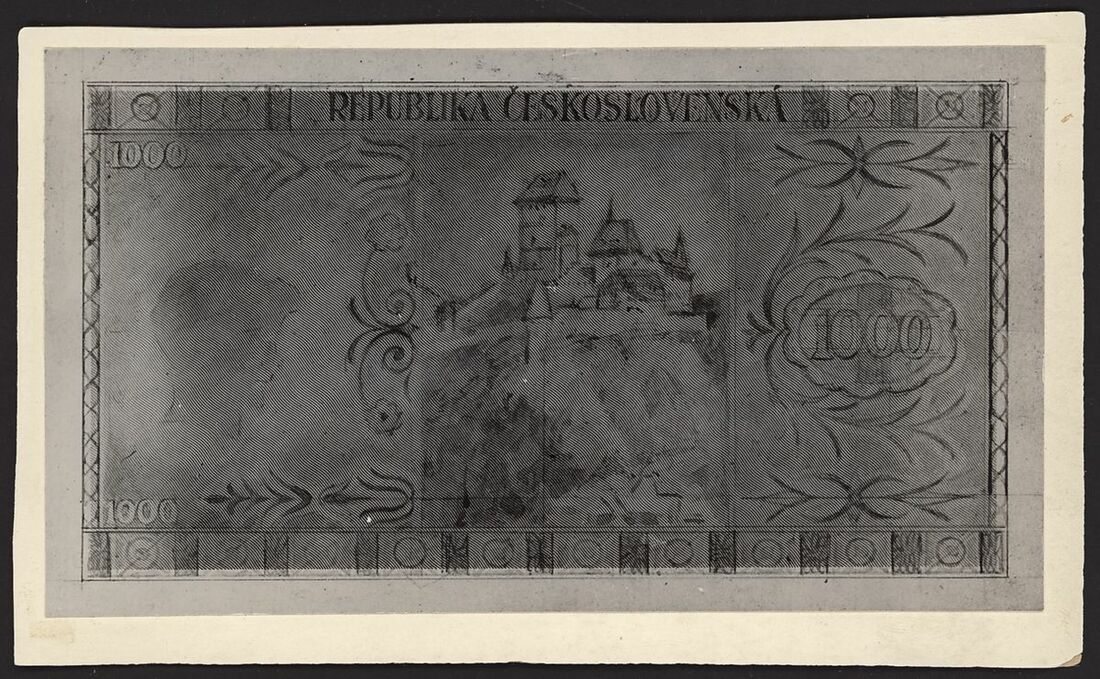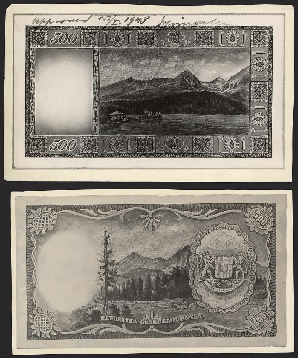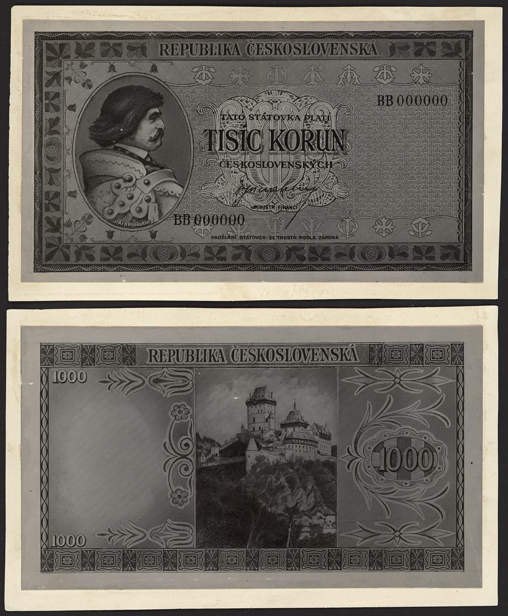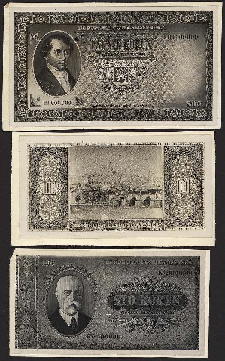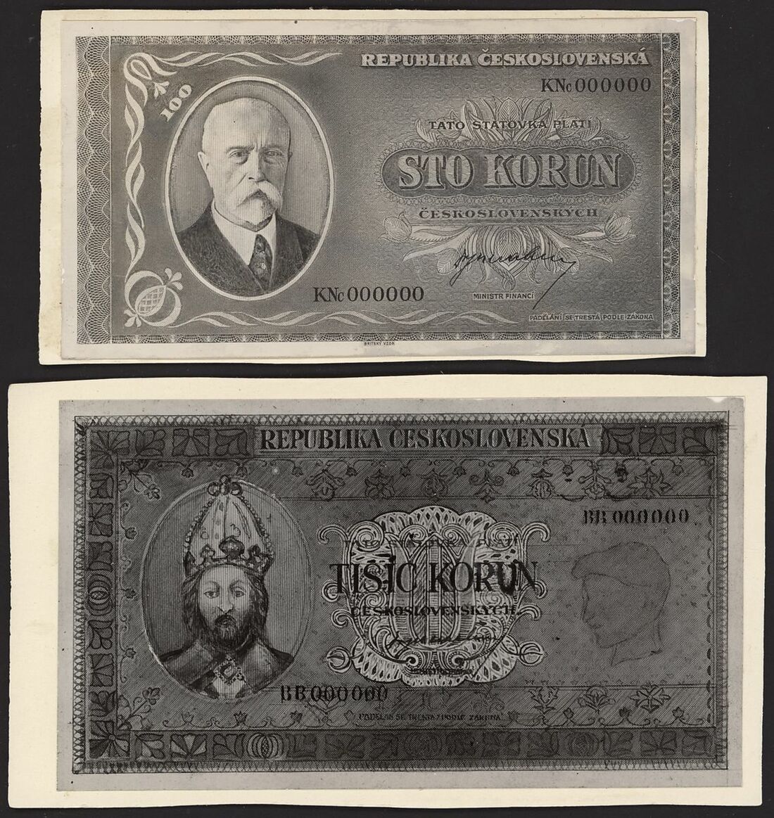 Republika Ceskoslovenska, Czechoslovakia, unissued photo proofs, group of obverse and reverse 10,000, 1000, 500, 100, 1941-1943, (15 pieces)