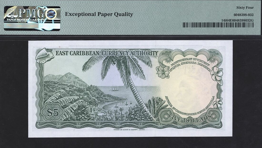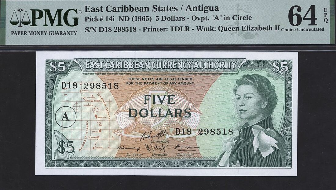 (x) East Caribbean Currency Authority, East Caribbean States / Antigua and Barbuda, $5, ND (1965), serial number D18 298518, (Pick 14i), in PMG holder 64 EPQ Uncirculated