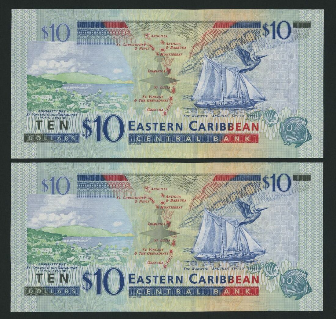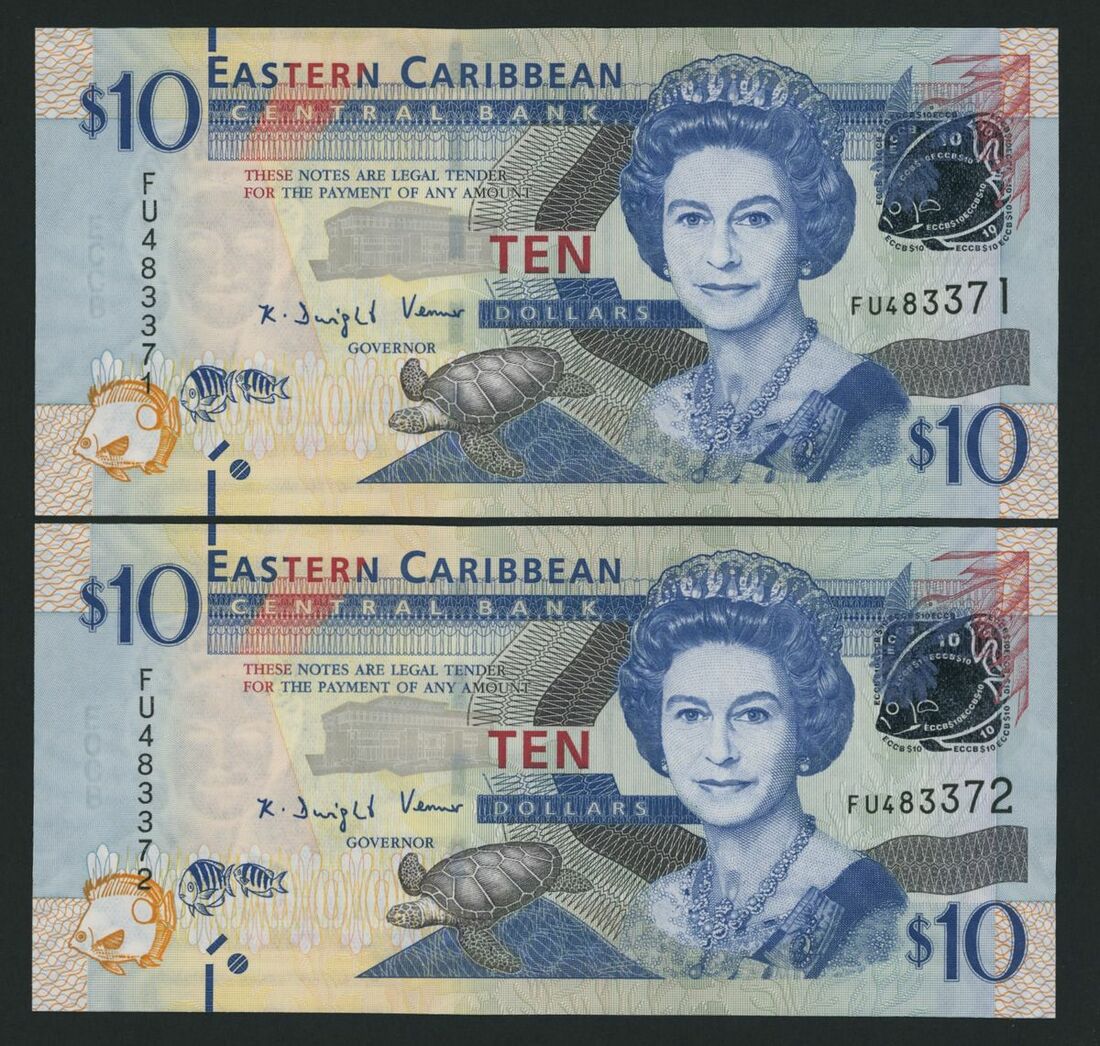 East Caribbean Central Bank, East Caribbean States, consecutive pair of 10 dollars, ND (1993), serial numbers FU483371-72, (Pick 27), uncirculated (2 notes)