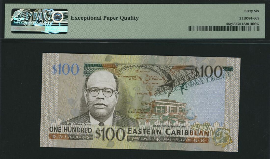 Eastern Caribbean Central Bank, East Caribbean States / Grenada, 100 dollars, ND (2003), serial number E135573G, (Pick 46g), in PMG holder 66 EPQ Gem Uncirculated