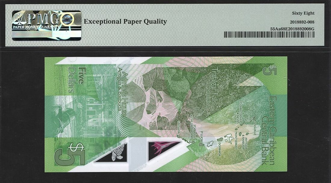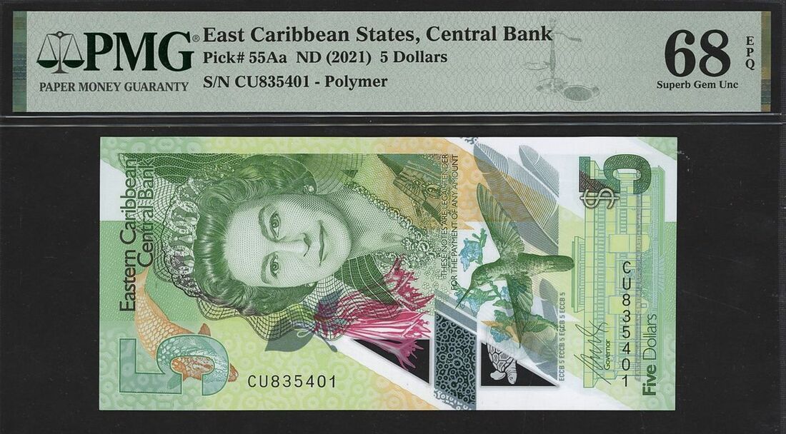 (x) Eastern Caribbean Central Bank, East Caribbean States, 5 dollars, ND (2021), serial number CU835401, (Pick 55Aa), in PMG holder 68 EPQ Superb Gem Uncirculated