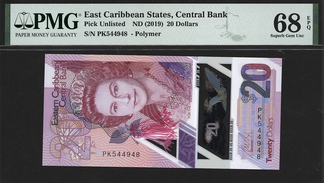(x) Eastern Caribbean Central Bank, East Caribbean States, 20 dollars, ND (2019), serial number PK544948, (Pick unlisted), in PMG holder 68 EPQ Superb Gem Uncirculated