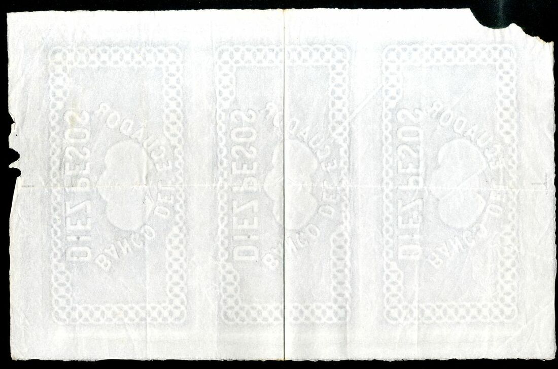 Banco del Ecuador, a sheet of watermark paper for three 10 pesos, ND (187-), (possibly Pick S141B for type), tear into one design, top left corner damage, horizontal crease, stain at right margin, scarce (230 x 350 mm)
