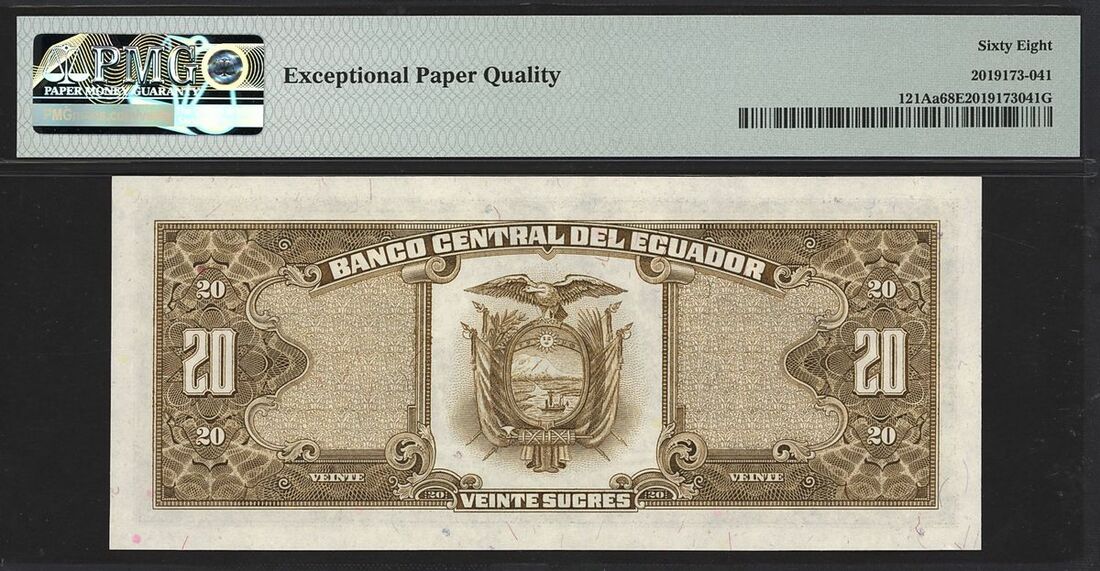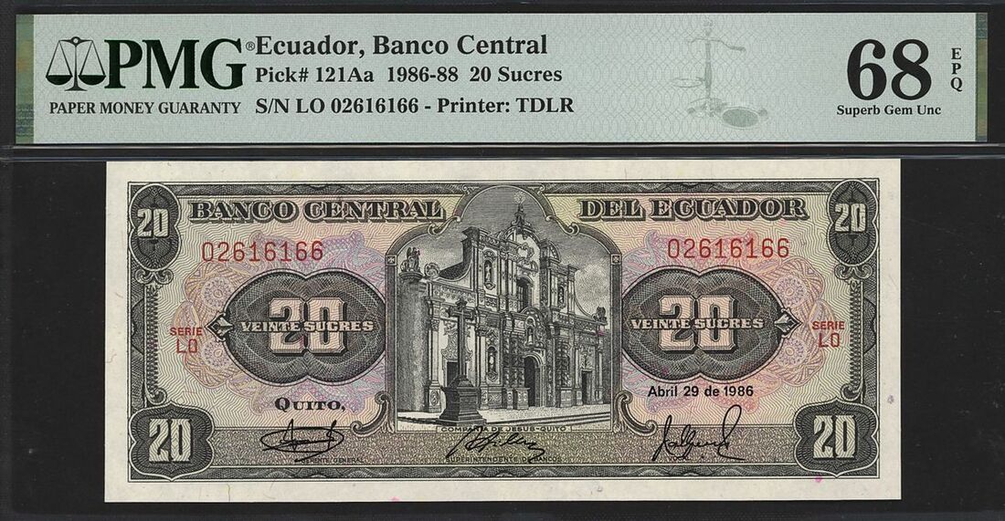 (x) Banco Central, Ecuador, 20 sucres, 1986-88, serial number LO 02616166, (Pick 121Aa), in PMG holder 68 EPQ Superb Gem Uncirculated