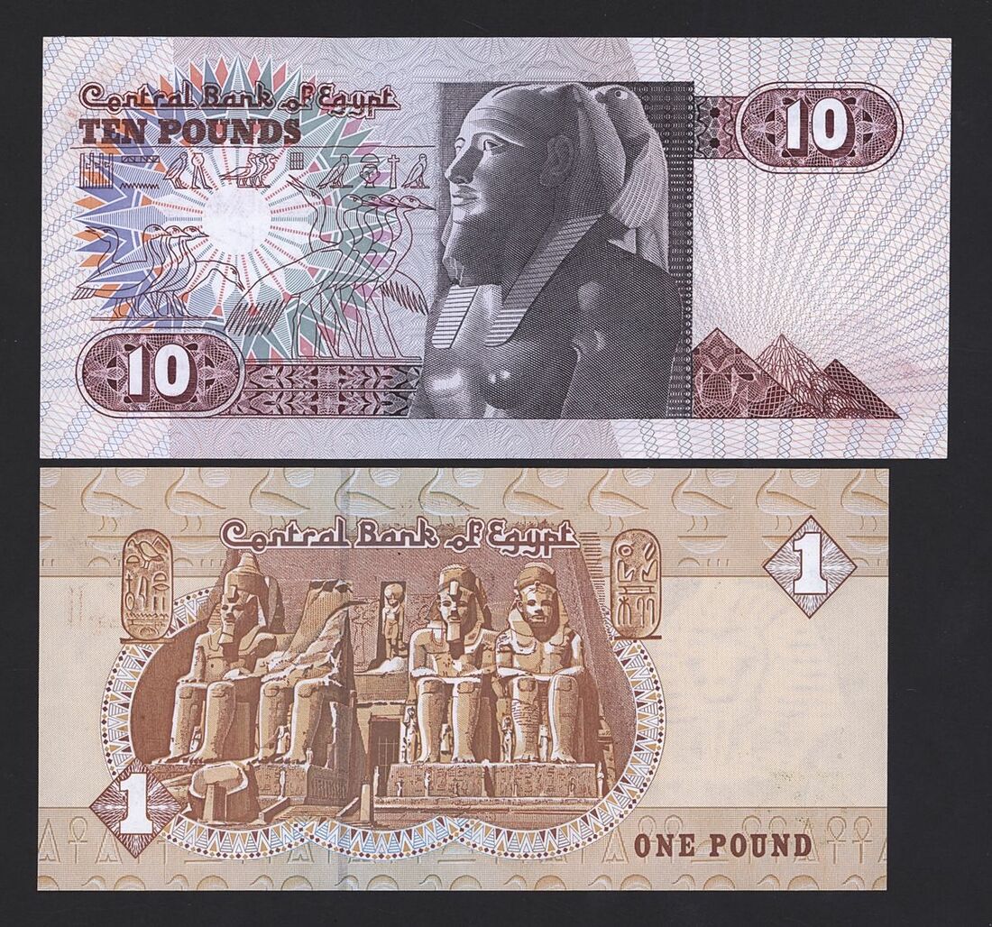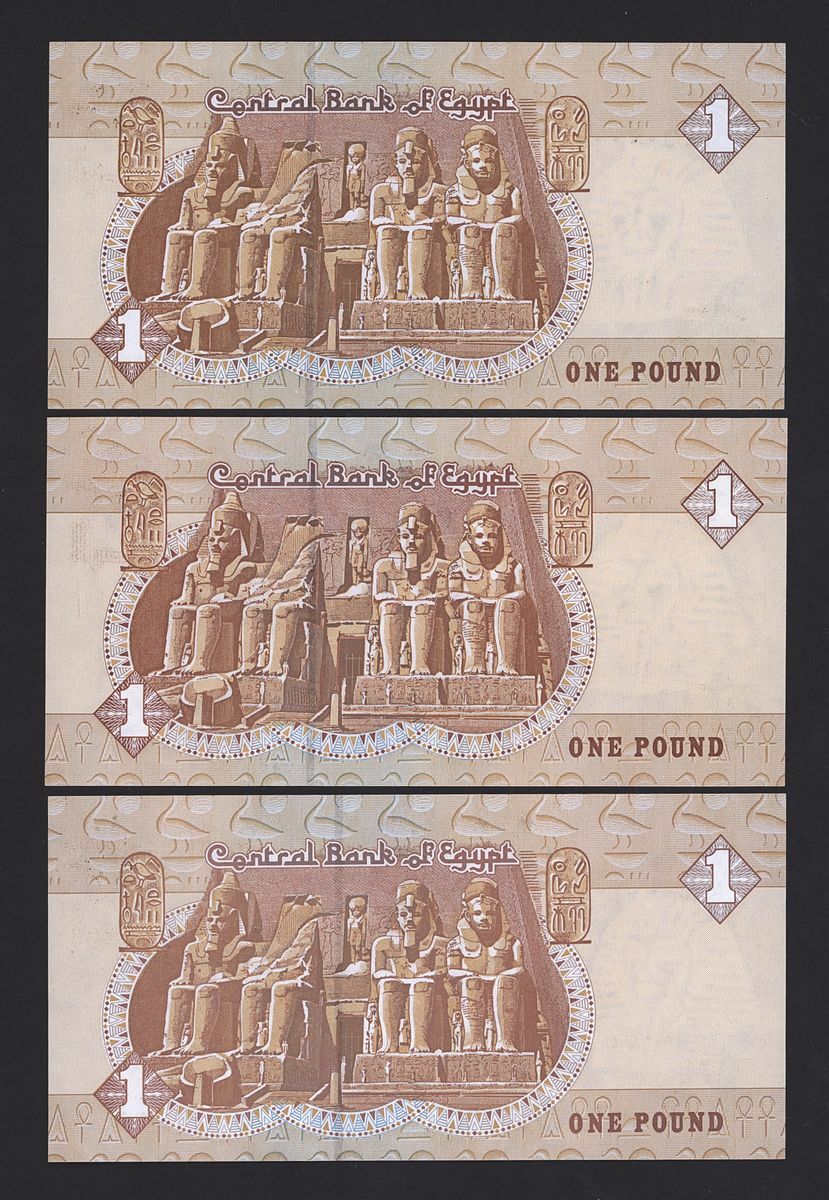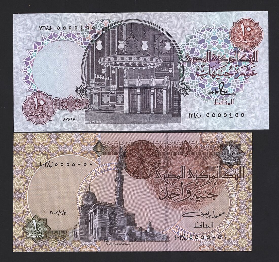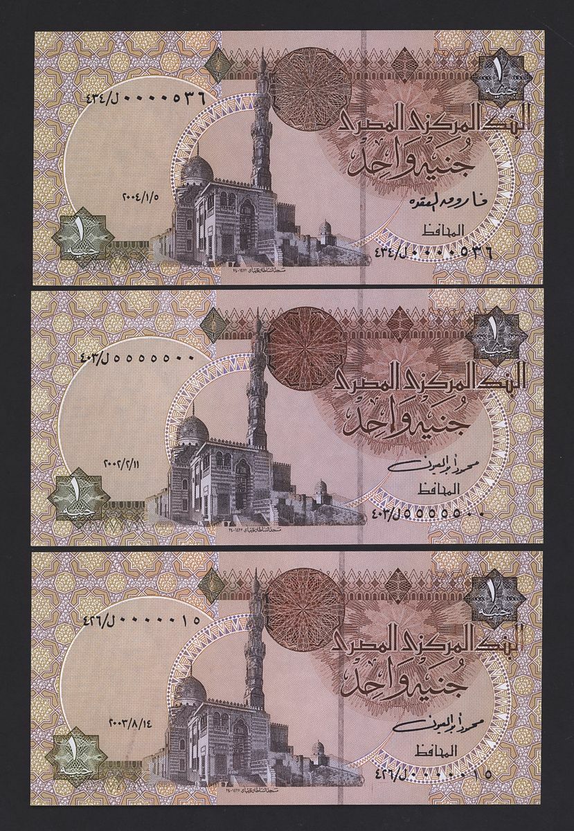 (x) Central Bank of Egypt, special and low serial numbers 1 pound serial number 5555050, 5555500,0000536, 0000015, 10 pounds serial number 5555455,