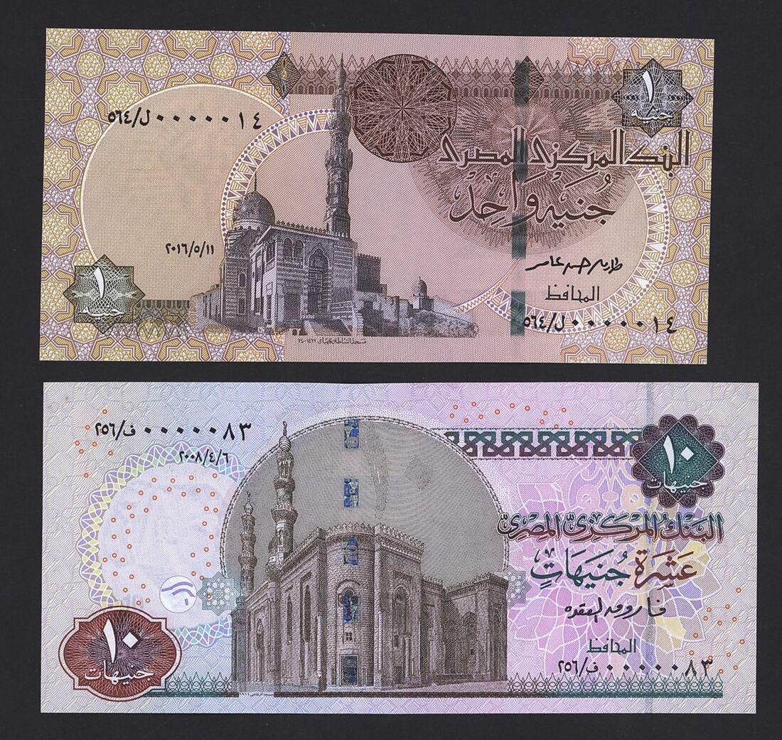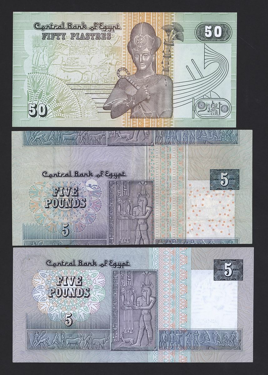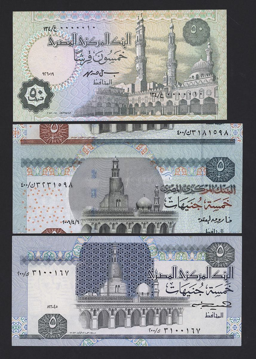 (x) Central Bank of Egypt, special and low serial numbers, 1 pounds 0000014, 10 pounds, 0000083, 50 piastres 0000010, 5 pounds 310067, also including 5 pounds cutting error
