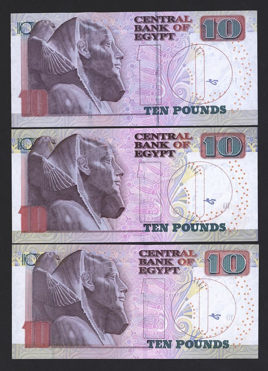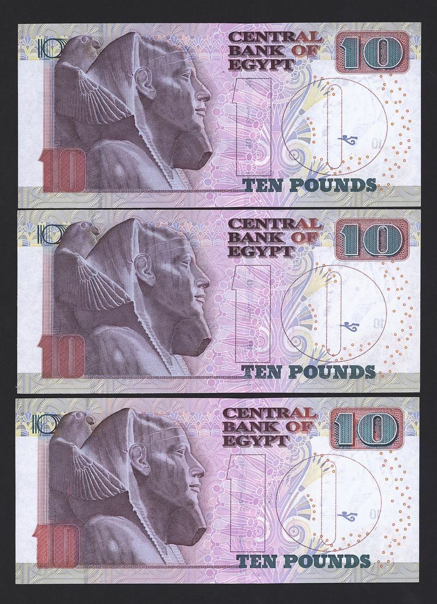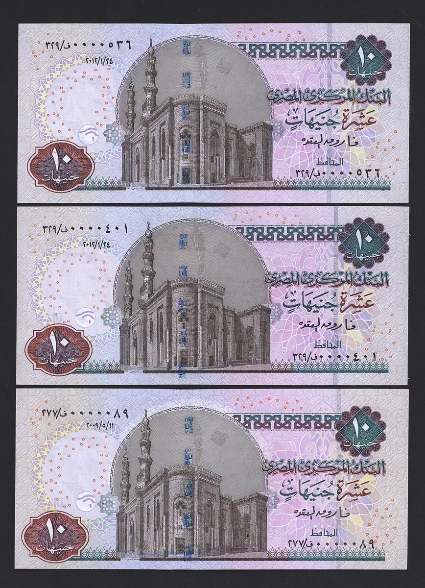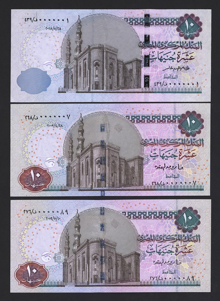 (x) Central Bank of Egypt, special and low serial numbers 10 pounds, 0000001, 0000007, 0000089, 0000089, 0000401, 0000536, 0000818, 0001818, 0033333,