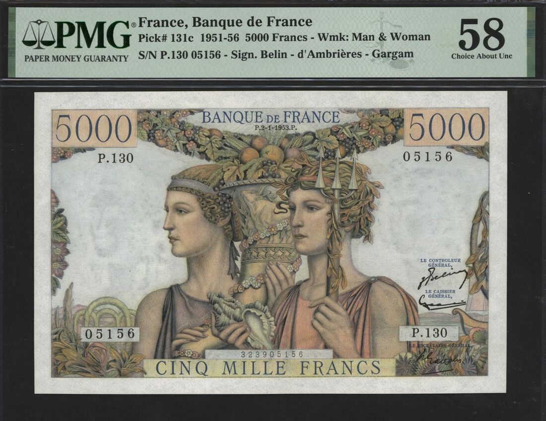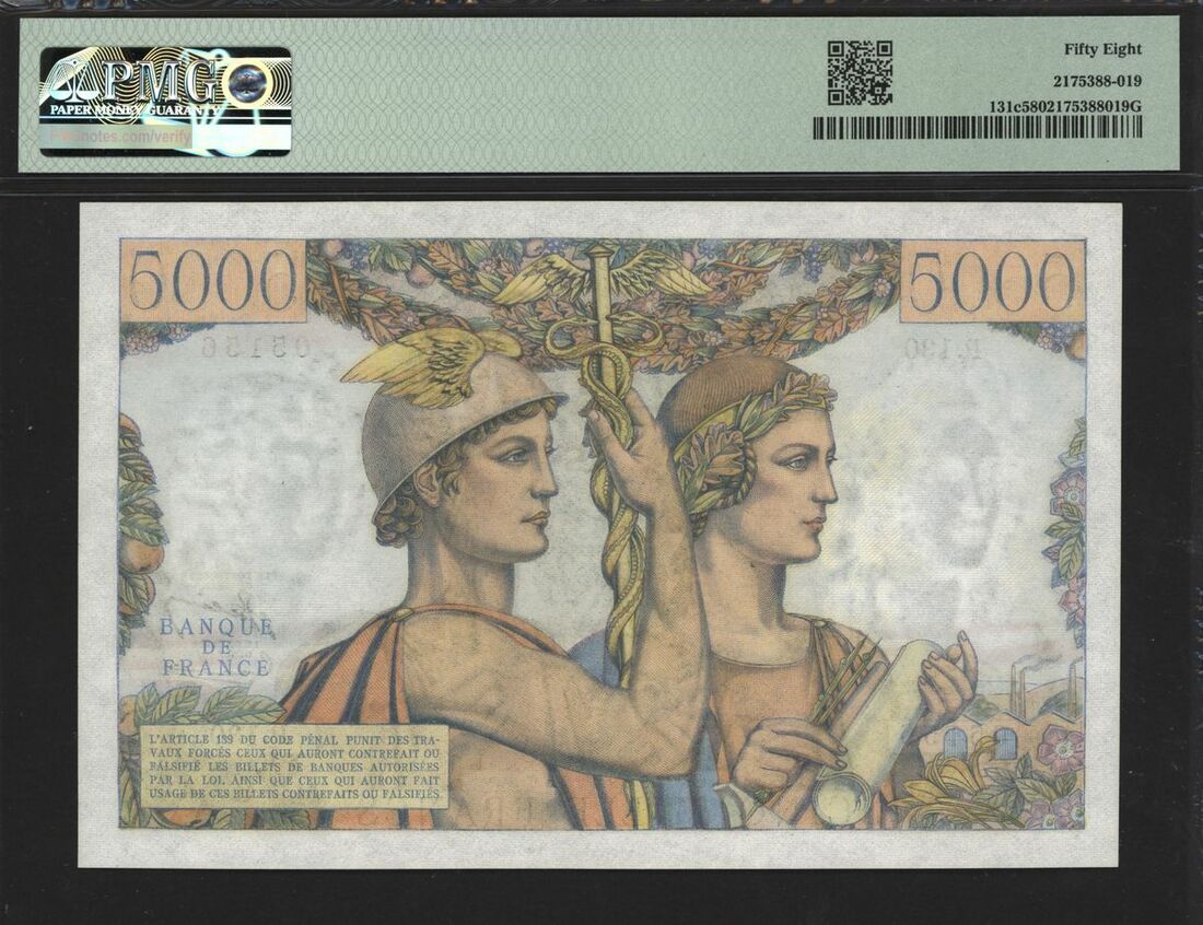 (x) Banque de France, 5000 francs, 1951-56, serial number P130 05156, (Pick 131c), in PMG holder 58 Choice About Uncirculated