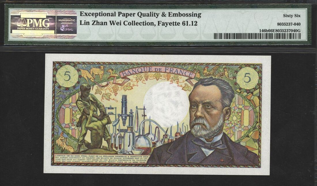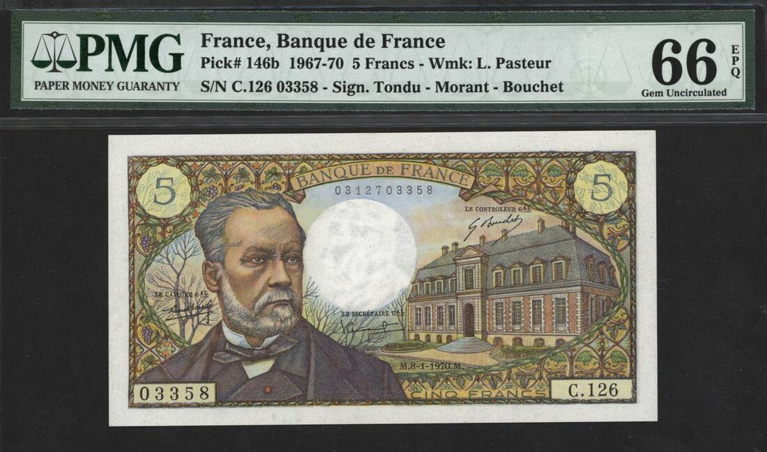 Banque de France, 5 francs, 1967-70, serial number C.126 03358, (Pick 146b), in PMG holder 66 EPQ Gem Uncirculated, Excellent Embossing, Lin Zhan Wei Collection