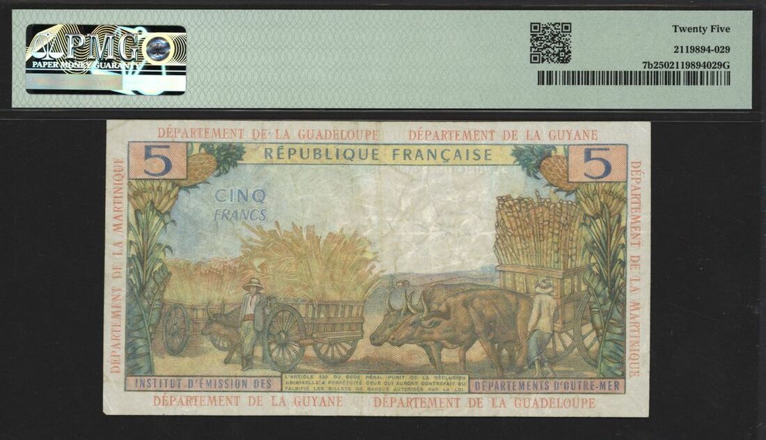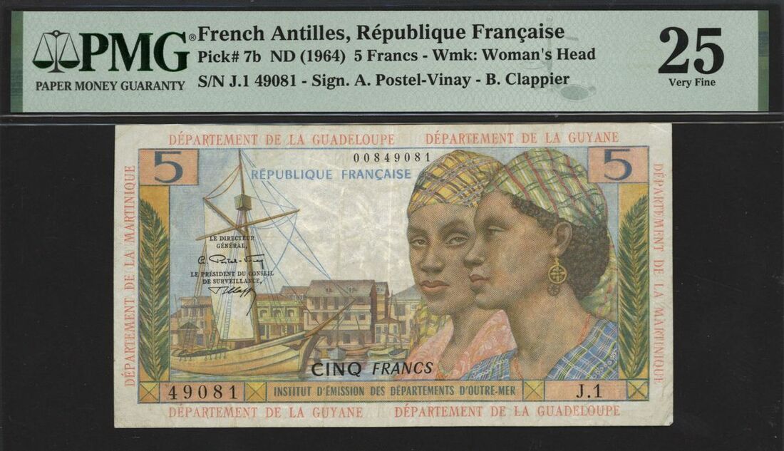 (x) Republic Francaise, French Antilles, 5 francs, ND (1964), serial number J1 49081, (Pick 7b), in PMG holder 25 Very Fine
