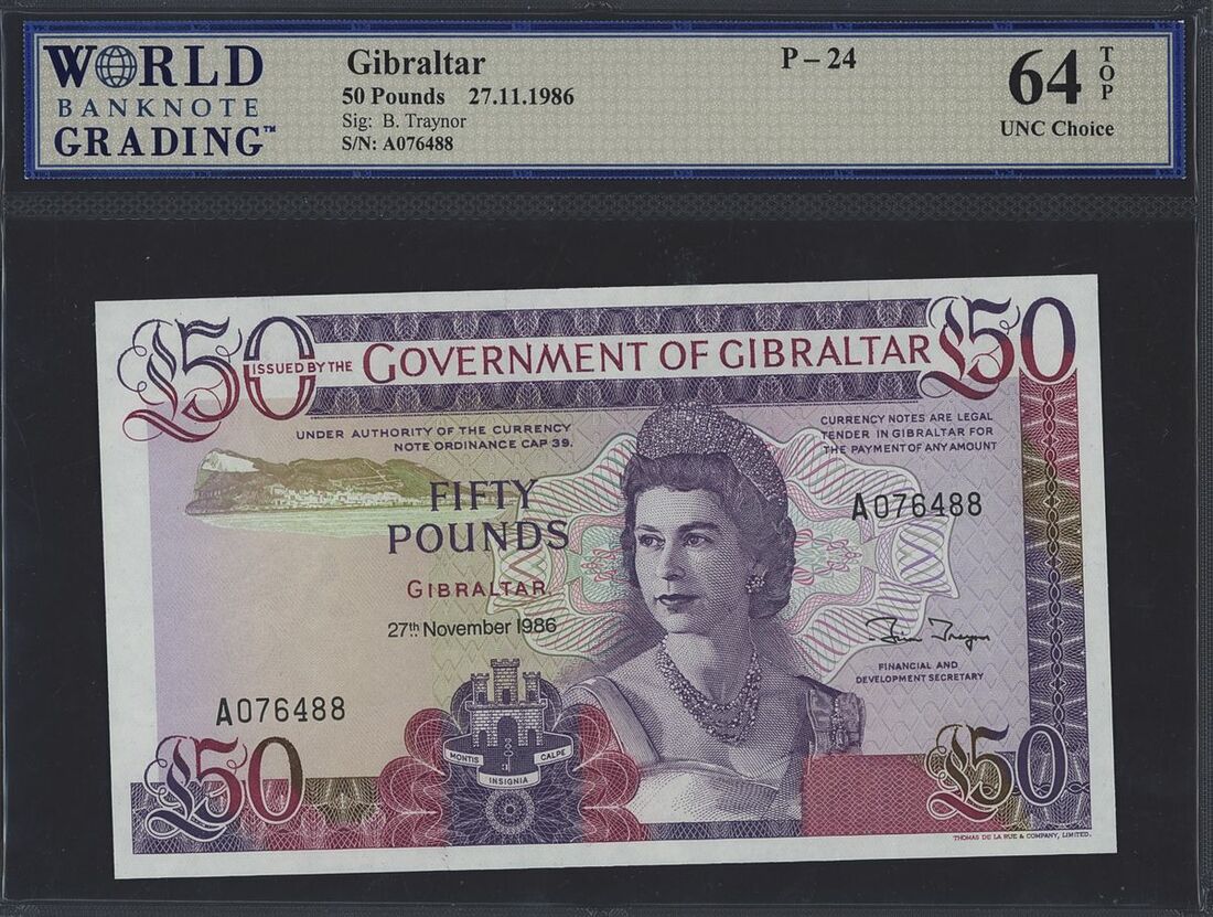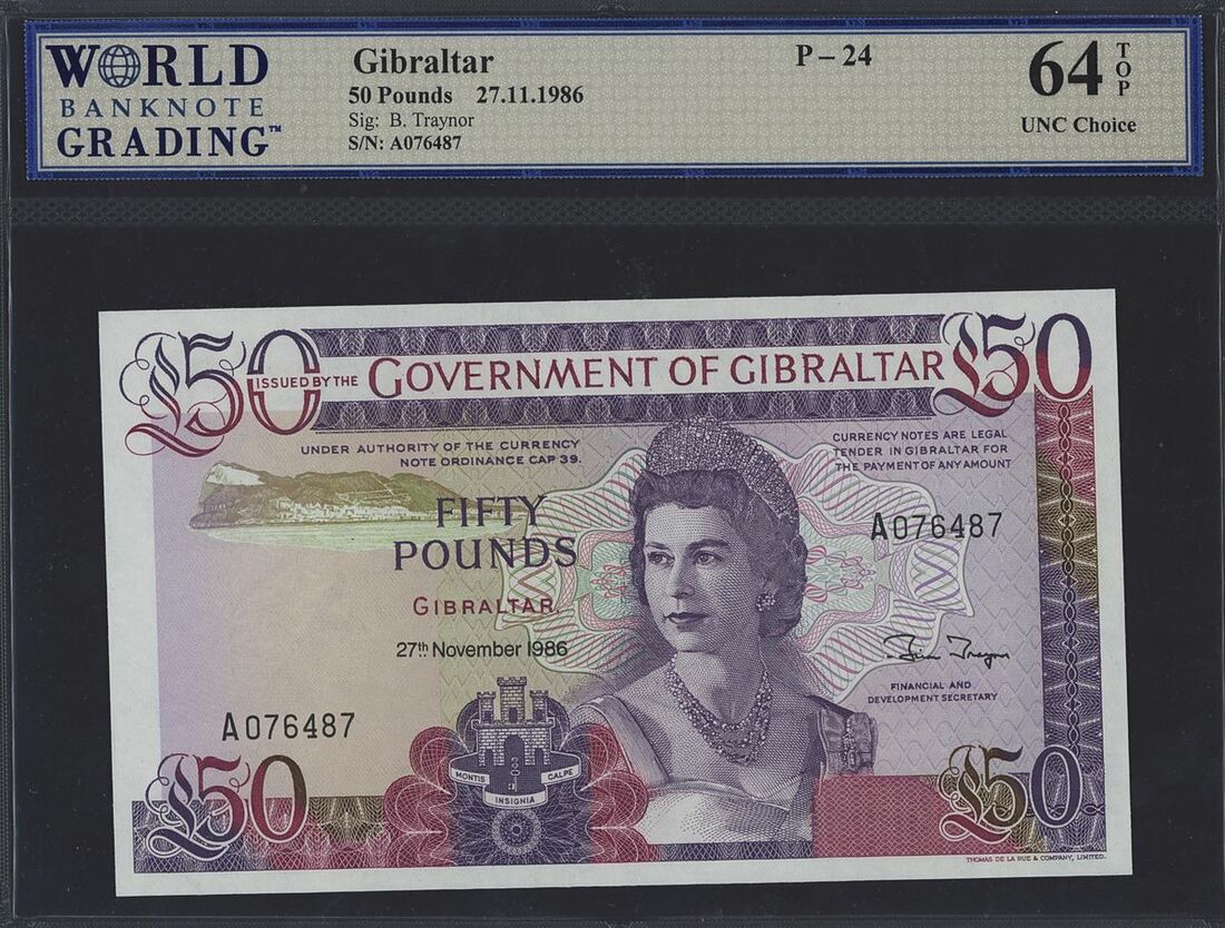 Government of Gibraltar, consecutive pair of £50, 1986, serial numbers A076487-8, (Pick 24), in PMG holder 64 TOP Choice Uncirculated, (2 notes)