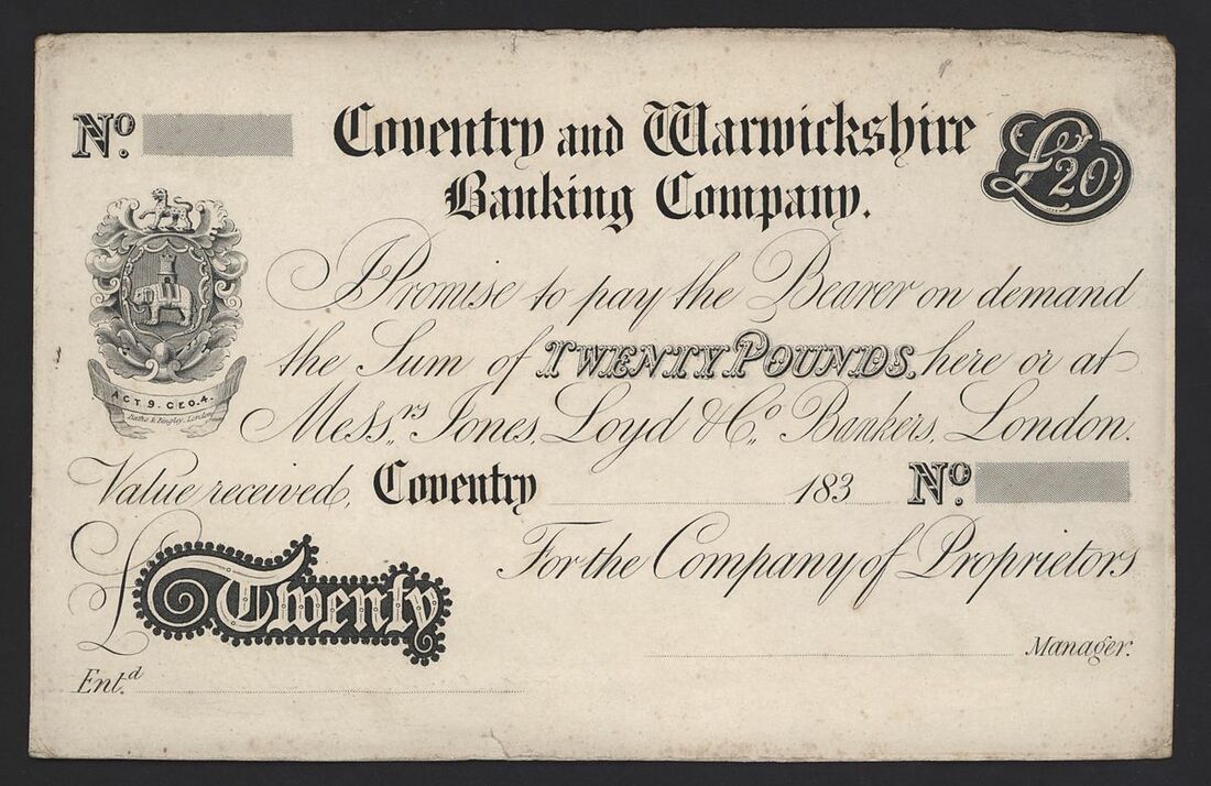 Coventry & Warwickshire Banking Company, Great Britain, proof £20, 183-, (Pick Unlisted, Outing 598), very fine